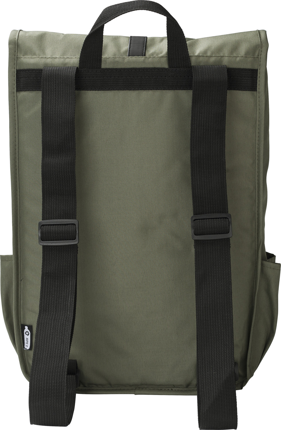RPET Polyester (300D) Rucksack mit Lasche. Zwei Flaschentaschen an der Seite. Ein großes Fach. Mit schwarzem PU-Gurt mit Verschlussschnalle.