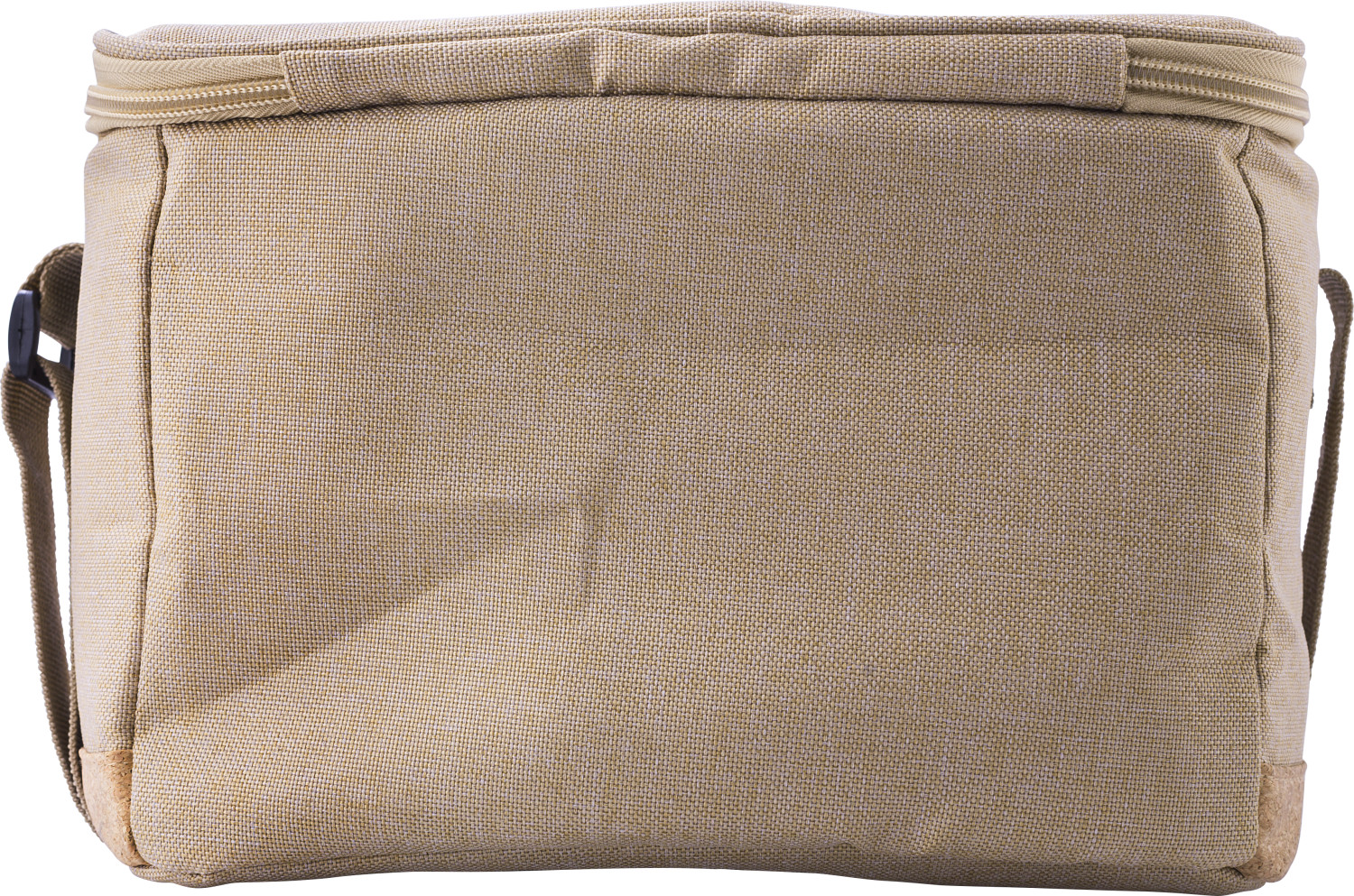 Kühltasche aus rPET-Polyester (600D). Boden aus Kork. PEVA-Innenseite. Kleine Tasche auf der Vorderseite. Verstellbarer Gurt. Mit rPET-Etikett.