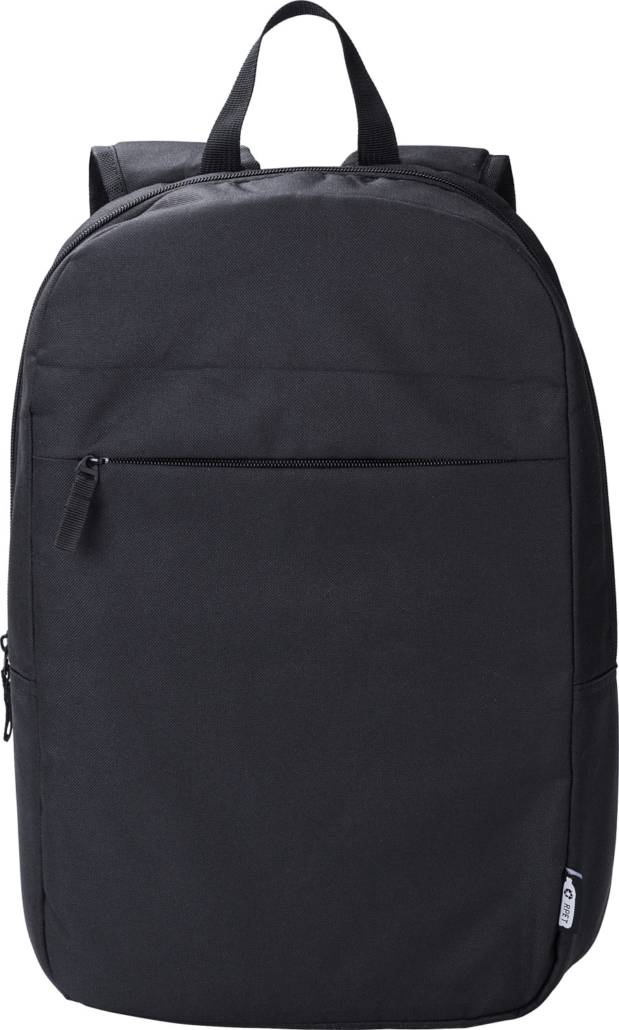 Laptop-Rucksack aus rPET-Polyester (600D) (15 Zoll). Ein großes Fach. Kleine Reißverschlusstasche auf der Vorderseite.
