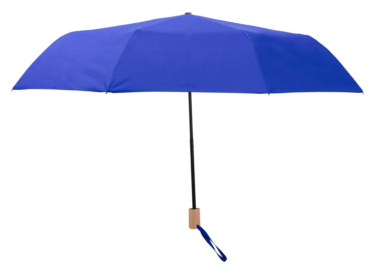 Manueller Taschenschirm mit 8 Segmenten und farblich abgestimmtem Etui. Material: Bespannung aus RPET, Metallrahmen, Fiberglas-Speichen und Griff aus Holz. Mit RPET-Label.
