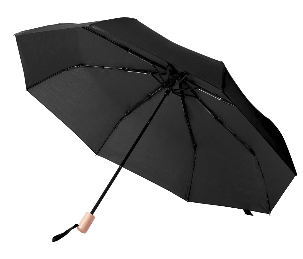Manueller Taschenschirm mit 8 Segmenten und farblich abgestimmtem Etui. Material: Bespannung aus RPET, Metallrahmen, Fiberglas-Speichen und Griff aus Holz. Mit RPET-Label.