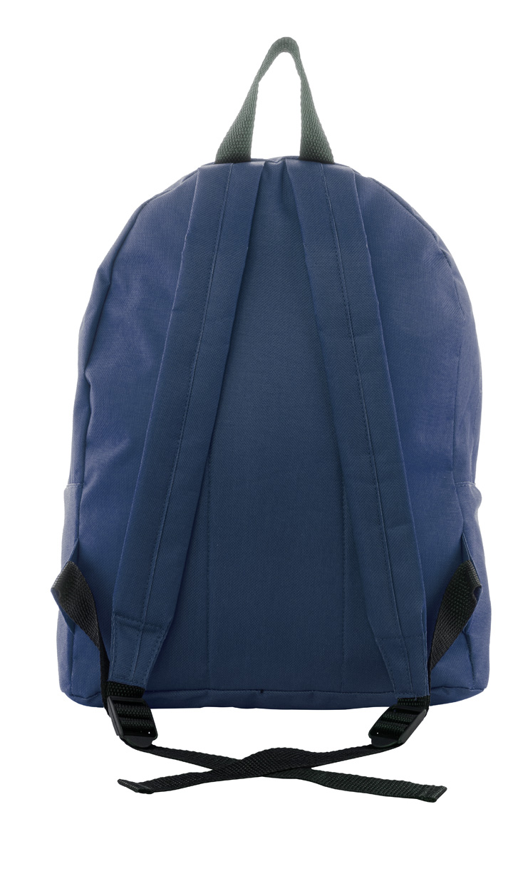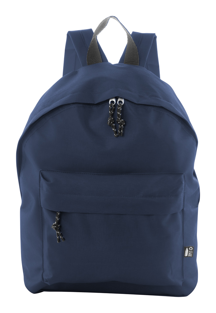 RPET-Rucksack mit Reißverschluss-Hauptfach, Reißverschluss-Vortasche, gepolstertem Rücken und Schultergurten. Material: 600D RPET-Polyester. Mit RPET-Label.