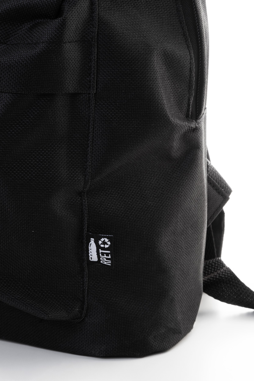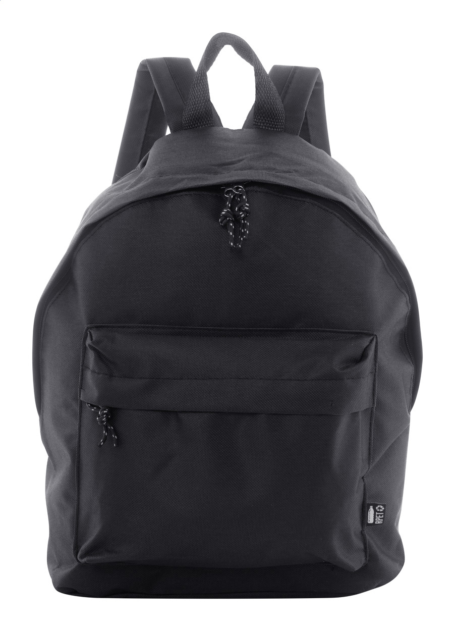 RPET-Rucksack mit Reißverschluss-Hauptfach, Reißverschluss-Vortasche, gepolstertem Rücken und Schultergurten. Material: 600D RPET-Polyester. Mit RPET-Label.