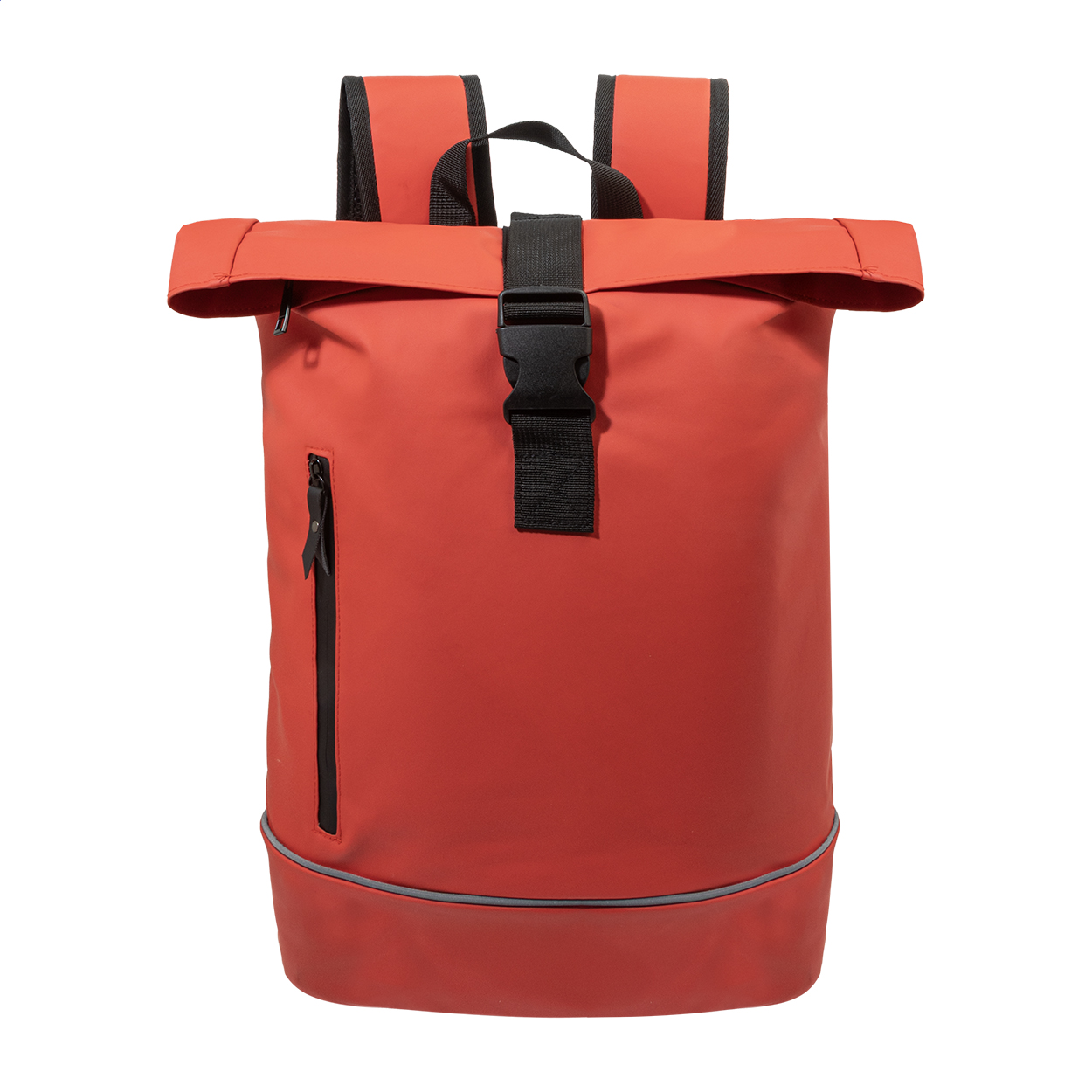 Wasserdichter, weicher Rolltop-Rucksack aus recyceltem Kunstleder mit Hauptfach mit Reißverschluss und Schnallenverschluss, Vordertasche mit wasserdichtem Reißverschluss, gepolstertem Laptopfach (bis 15 Zoll) und Reflektorstreifen. Gepolsterter Rücken und Schultergurte. Mit Label recyceltes PU.