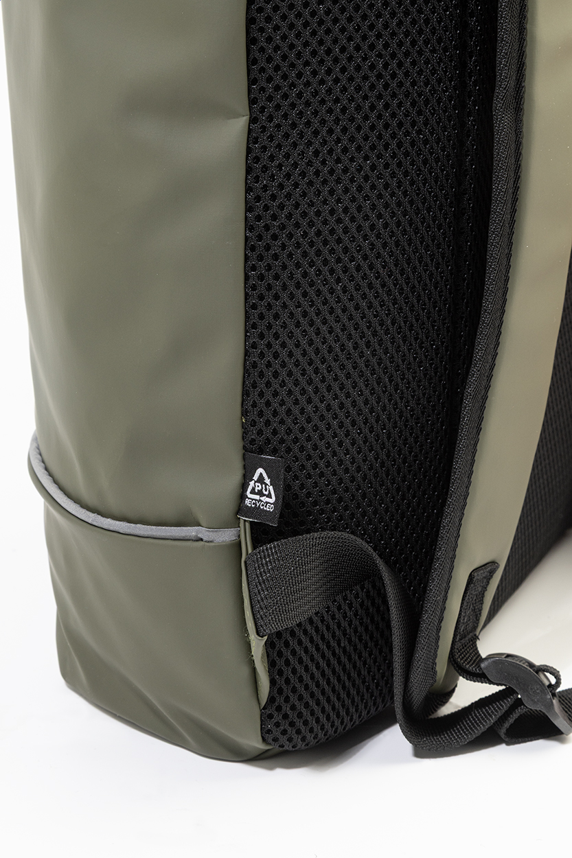Wasserdichter, weicher Rolltop-Rucksack aus recyceltem Kunstleder mit Hauptfach mit Reißverschluss und Schnallenverschluss, Vordertasche mit wasserdichtem Reißverschluss, gepolstertem Laptopfach (bis 15 Zoll) und Reflektorstreifen. Gepolsterter Rücken und Schultergurte. Mit Label recyceltes PU.
