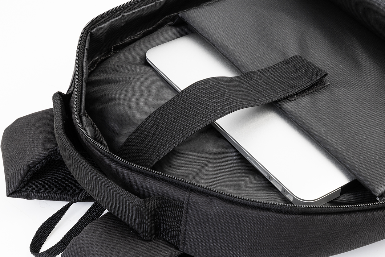 Rucksack aus RPET mit Reißverschluss-Hauptfächern, 2 Reißverschluss-Vordertaschen, Reißverschluss-Seitentaschen und gepolstertem Laptopfach (15"). Mit geposlterten Rücken und Schultergurten, Anti-Diebstahl-Fach und Trolley-Gurt. Material: 300D RPET Polyester. Mit Label RPET.