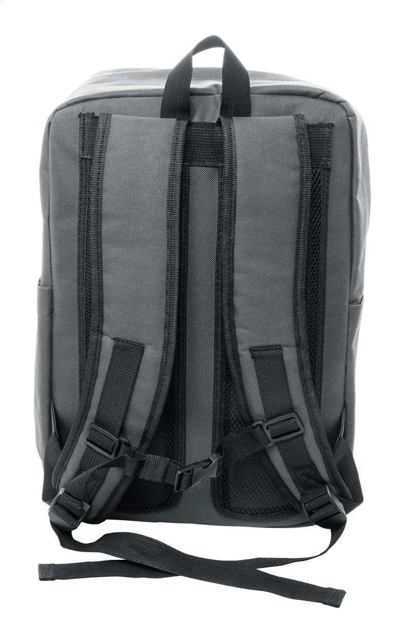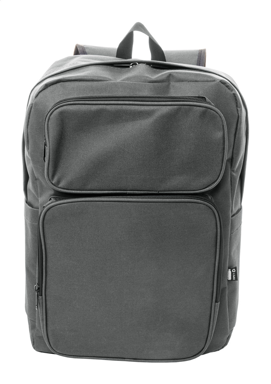 RPET-Rucksack mit Hauptfach mit Reißverschluss, 2 Vordertaschen mit Reißverschluss, Seitentaschen und gepolstertem Fach für Laptop (15") und Tablet (10"). Mit gepolstertem Rücken und Schultergurten. 600D RPET-Polyester, mit unverwechselbarem RPET-Label.