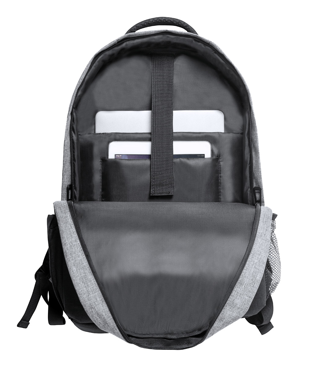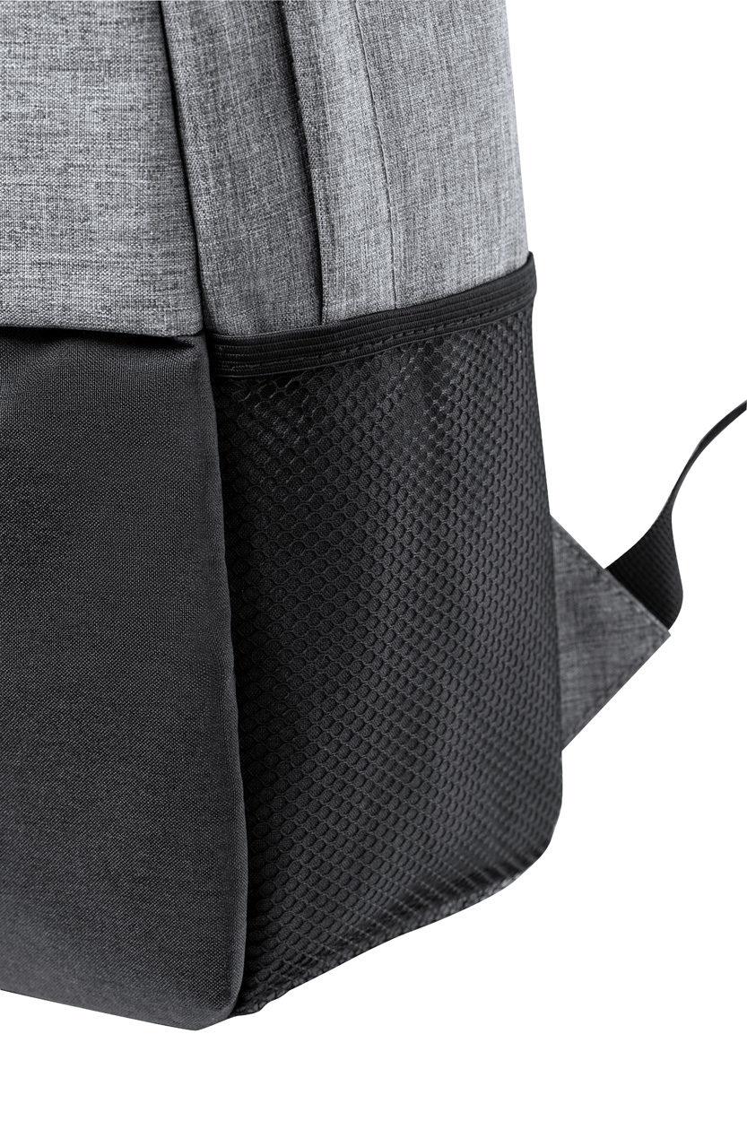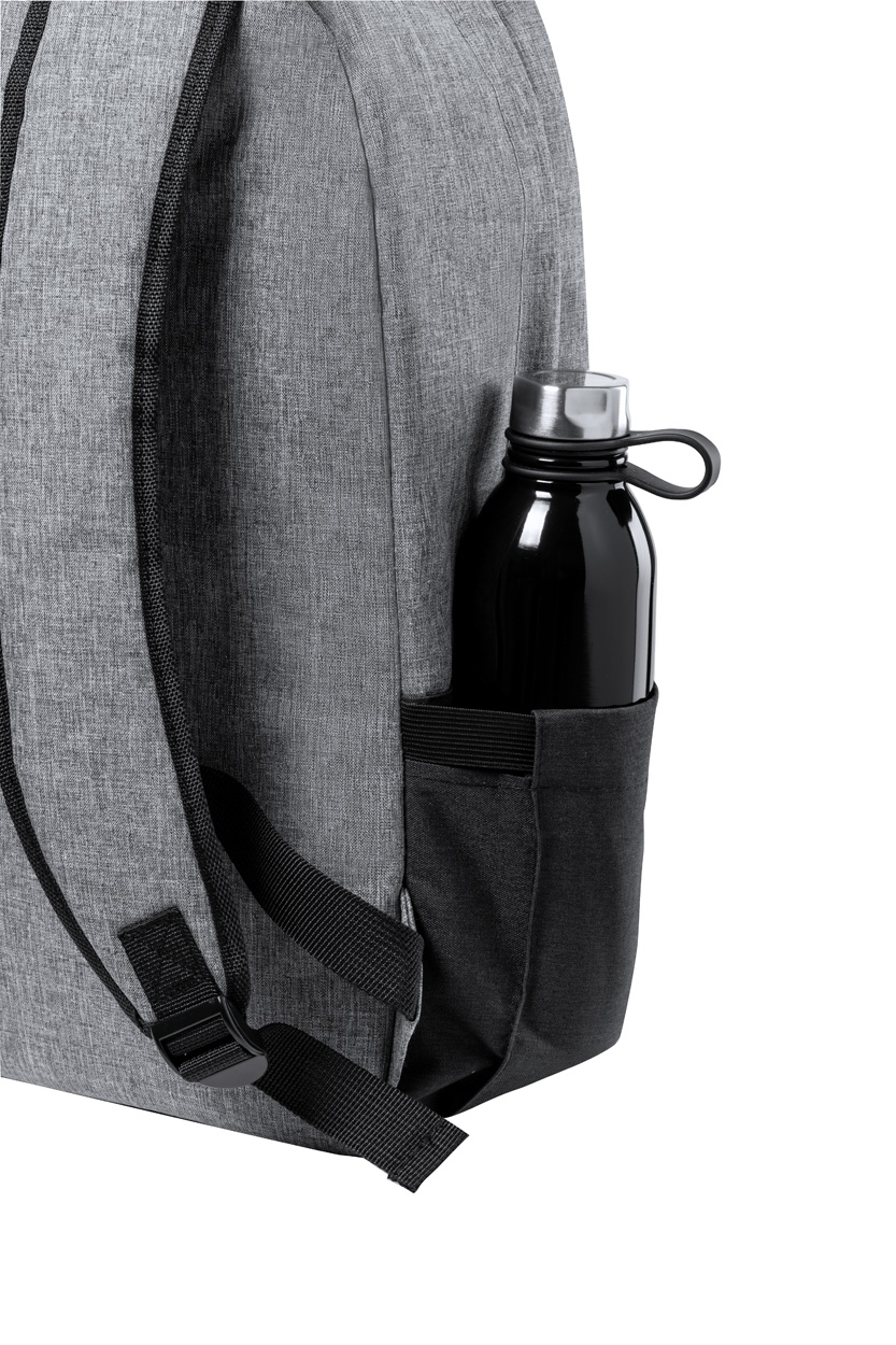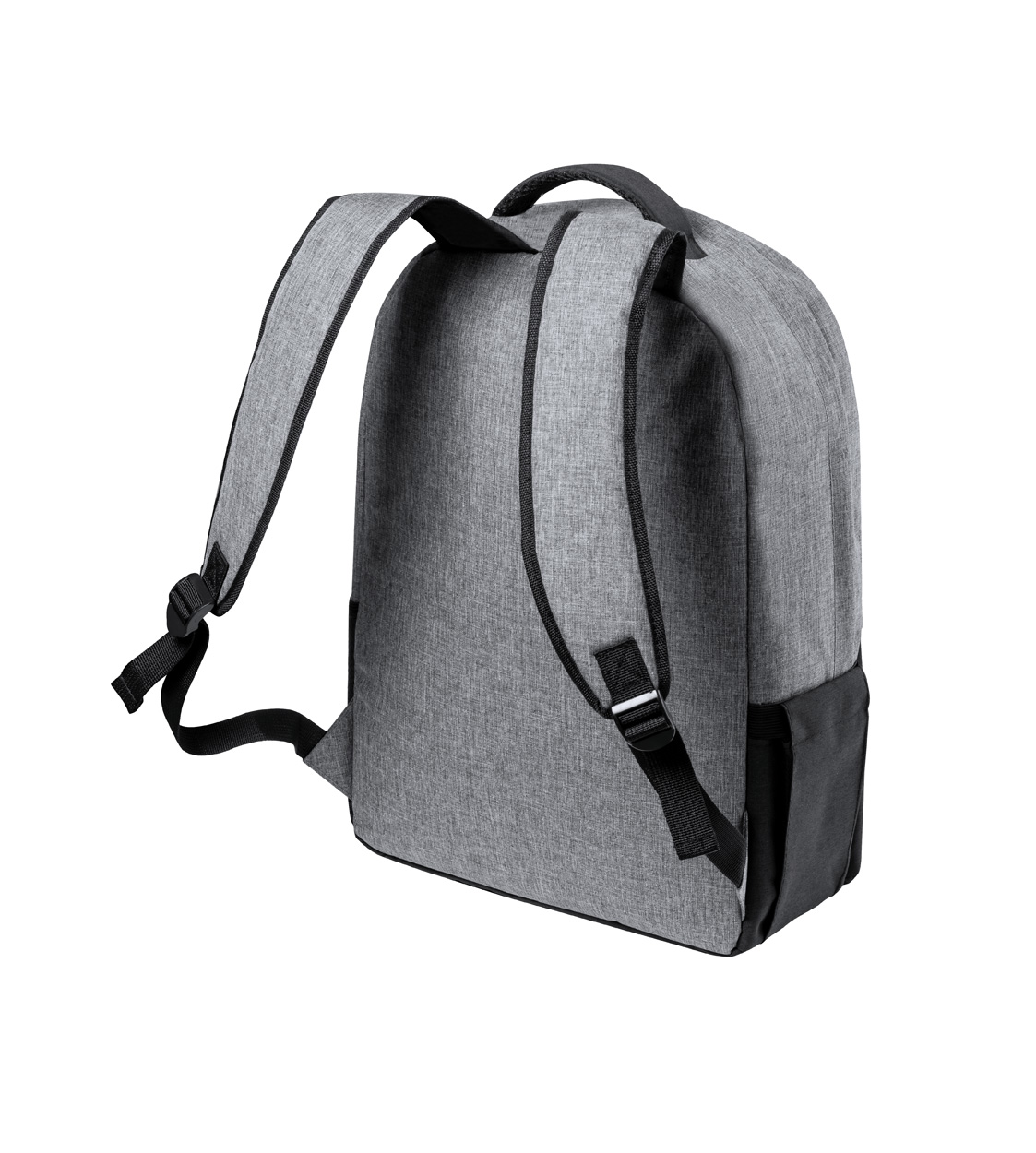 RPET-Doppelfunktionsrucksack mit Hauptfach mit Reißverschluss, gepolstertem Laptop- (15") und Tabletfach (10"), Seitentaschen, gepolstertem Rücken und Schultergurten. Material: 600D RPET Polyester.