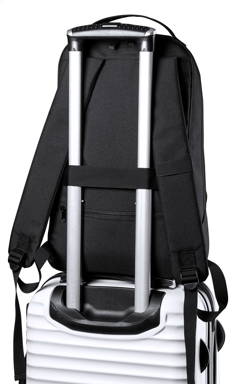 Wasserdichter RPET-Rucksack mit Reißverschlussfächern, gepolstertem Laptop- (15") und Tablet- (10") Fach, Trolleygurt, versteckter Diebstahlsicherungstasche, ergonomischen Rücken- und Schultergurten. Material: 600D RPET-Polyester. Mit RPET-Label.
