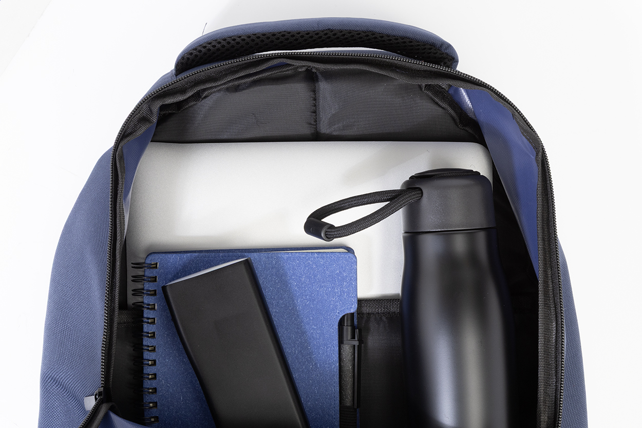 RPET-Outdoor-Rucksack mit Reißverschlussfächern und Vordertasche, gepolstertem Laptopfach (bis 15"), seitlichen Netztaschen und elastischen Kordeln an der Vorderseite. Gepolsterter Rücken und Schultergurte. Material: 600D-RPET-Polyester. Mit Label RPET.