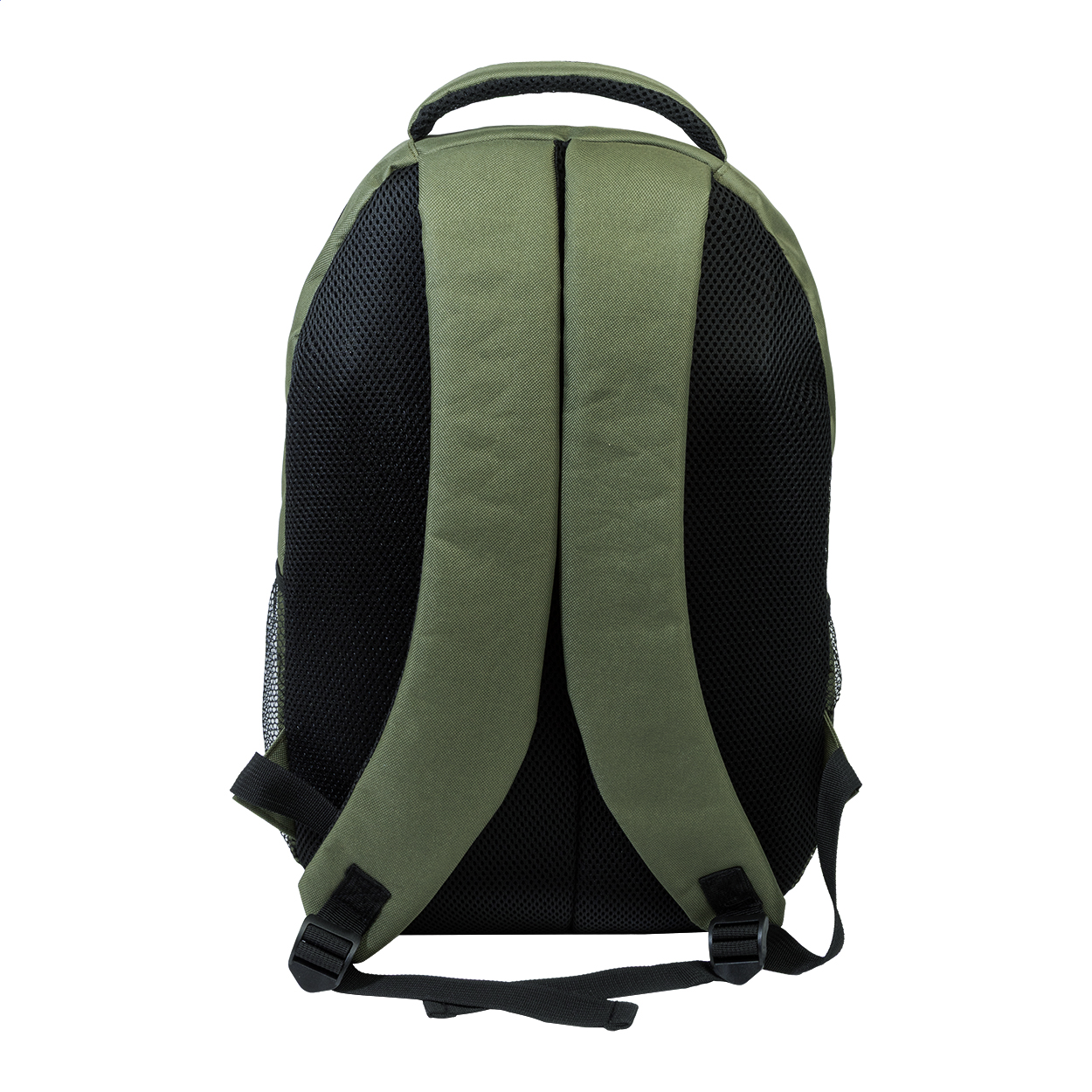 RPET-Outdoor-Rucksack mit Reißverschlussfächern und Vordertasche, gepolstertem Laptopfach (bis 15"), seitlichen Netztaschen und elastischen Kordeln an der Vorderseite. Gepolsterter Rücken und Schultergurte. Material: 600D-RPET-Polyester. Mit Label RPET.