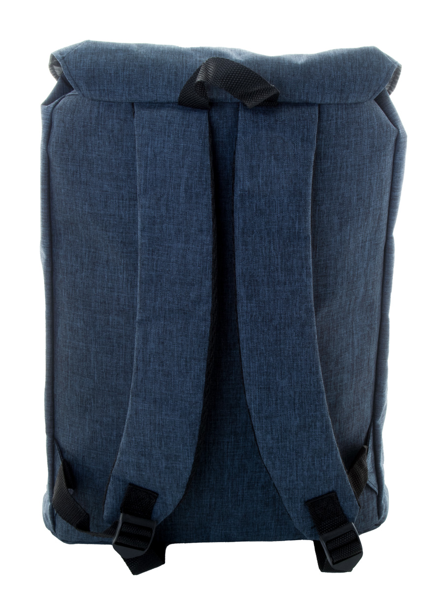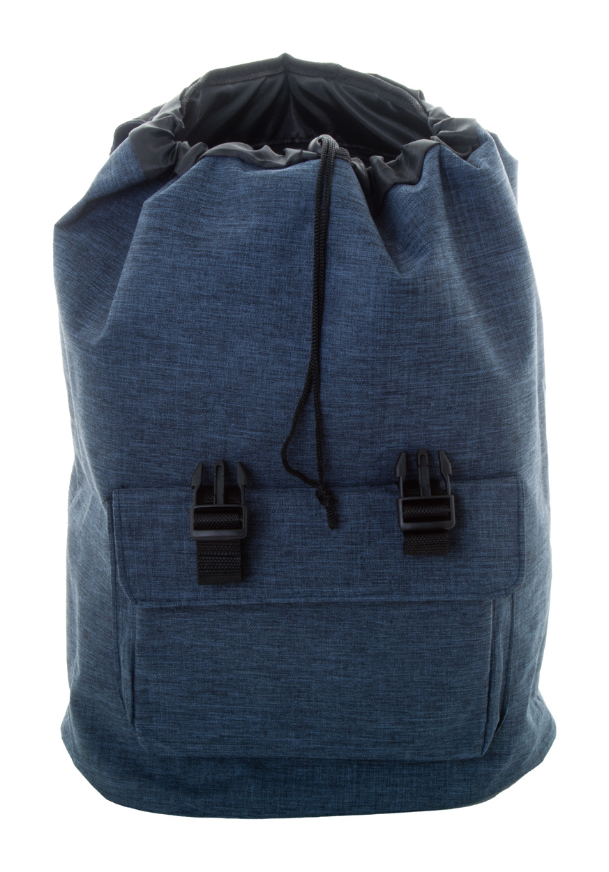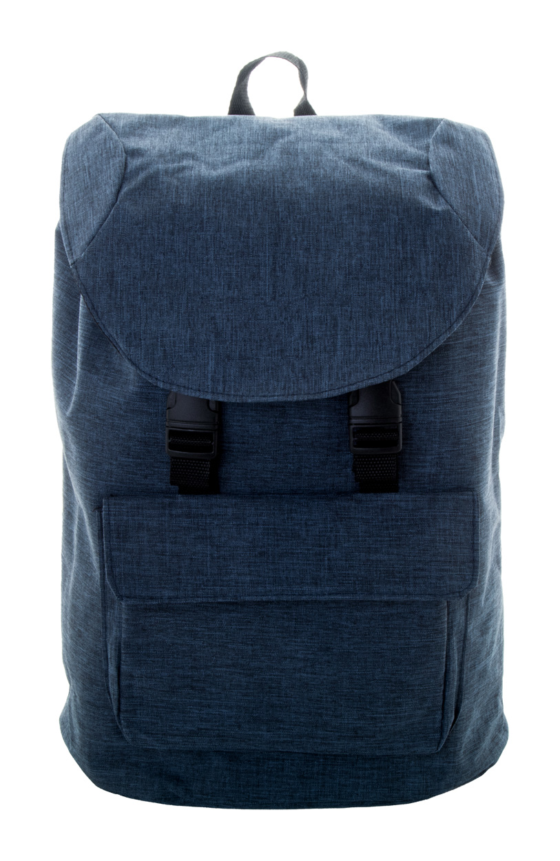 Rucksack aus RPET mit Schnallen- und Kordelzugverschluss, Klettverschlusstasche vorne, gepolstertem Laptopfach (16"), gepolstertem Rücken und Schultergurten. Material: 300D RPET-Polyester. Mit RPET-Label.