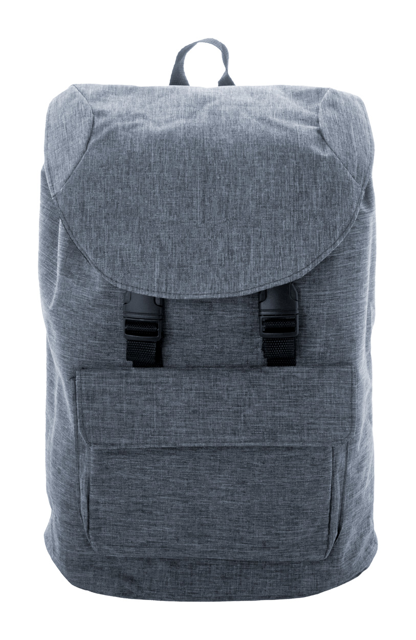 Rucksack aus RPET mit Schnallen- und Kordelzugverschluss, Klettverschlusstasche vorne, gepolstertem Laptopfach (16"), gepolstertem Rücken und Schultergurten. Material: 300D RPET-Polyester. Mit RPET-Label.