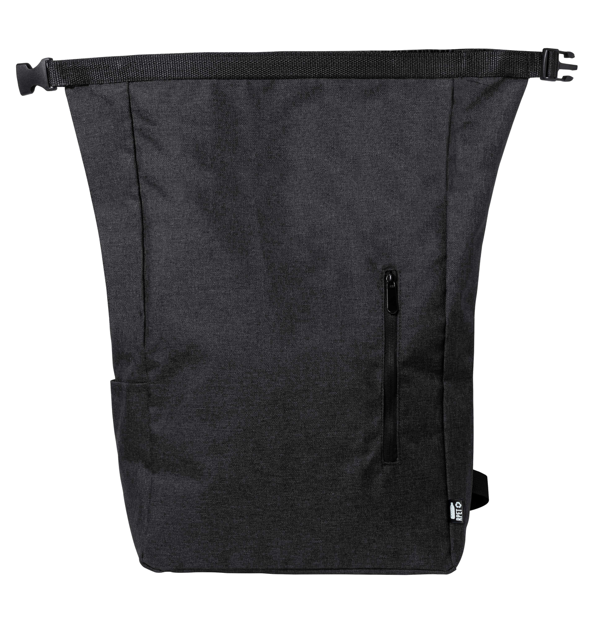Wasserfester Rolltop-Rucksack aus RPET mit Seitentasche, Reißverschluss-Vorderfach und ergonomischen Rücken und Schultergurten. Material: 300D RPET Polyester, mit abtrennbarem RPET-Label.