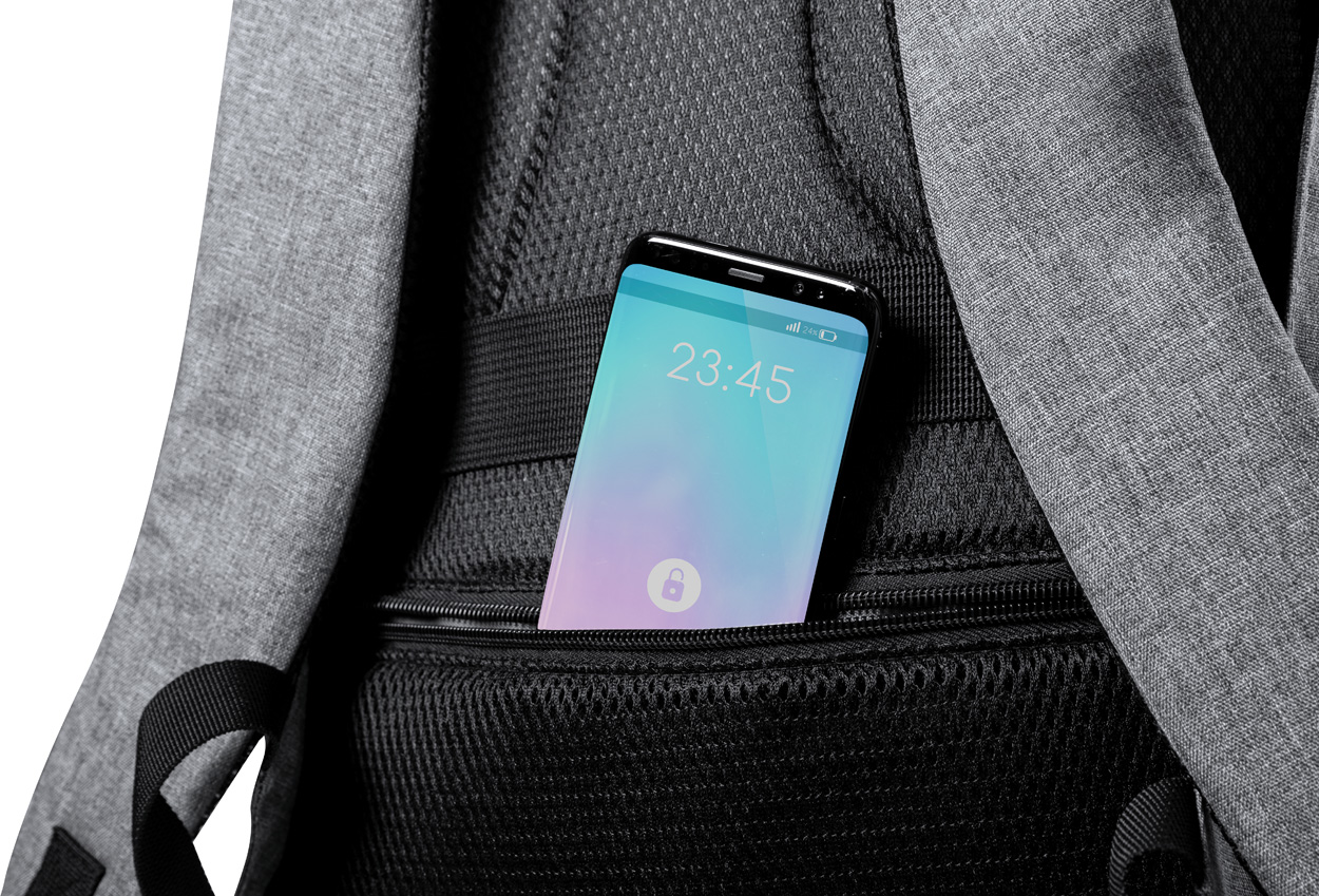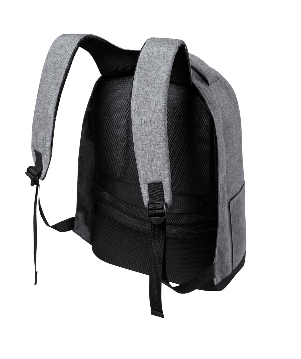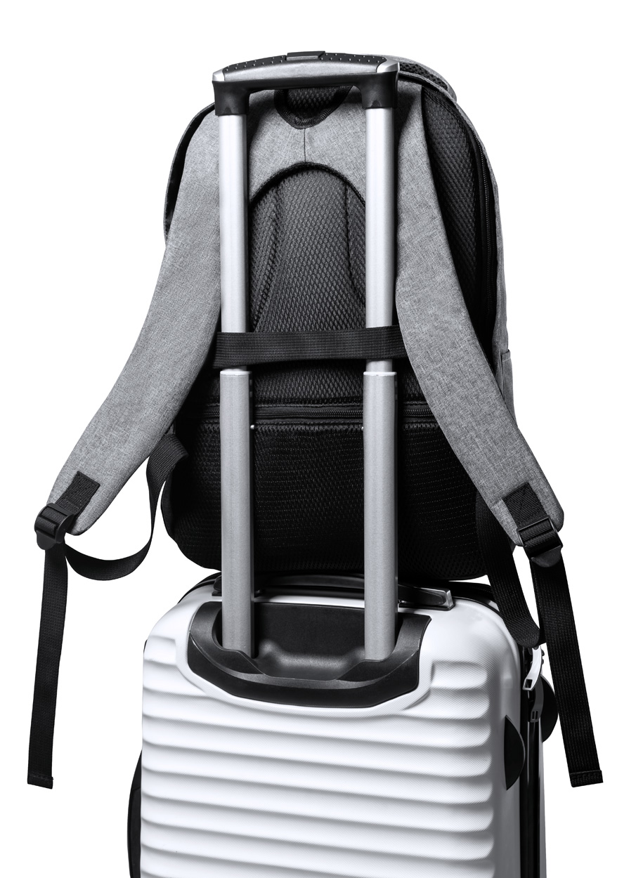 RPET-Rucksack mit Reißverschlussfächern, gepolstertem Laptop- (15") und Tabletfach (12"), Trolleygurt, ergonomischem Rücken- und Schultergurt. Mit verstecktem Anti-Diebstahl-Fach. Material: 600D RPET Polyester.