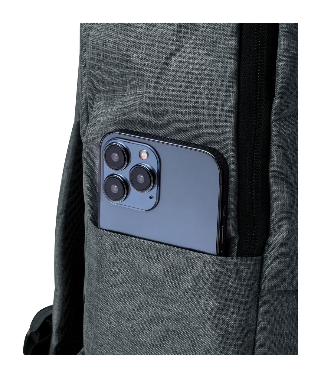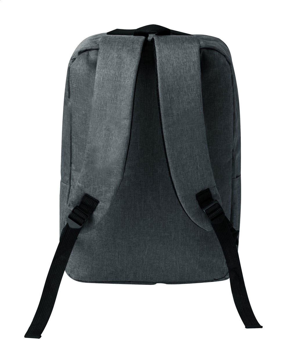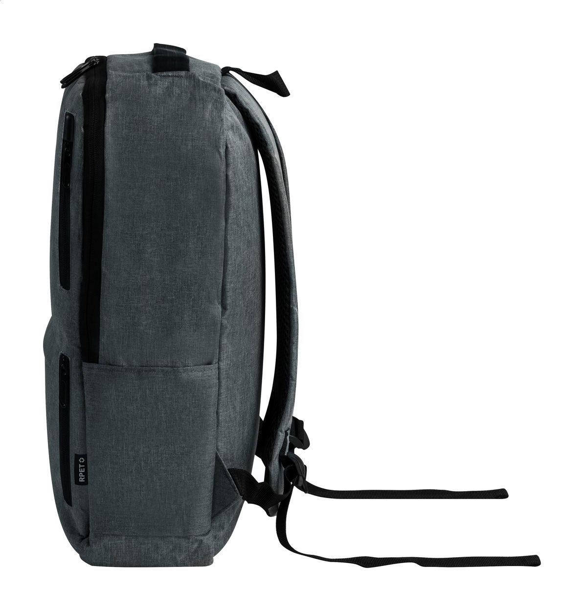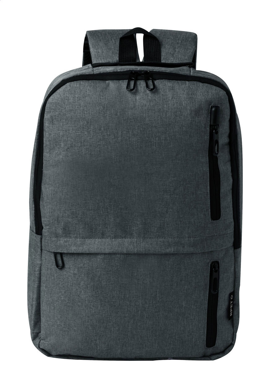RPET-Rucksack mit Reißverschlussfächern, gepolstertem Laptop- (15") und Tabletfach (10"), gepolstertem Rücken und Schultergurten. Material: 600D RPET-Polyester. Mit RPET-Label.