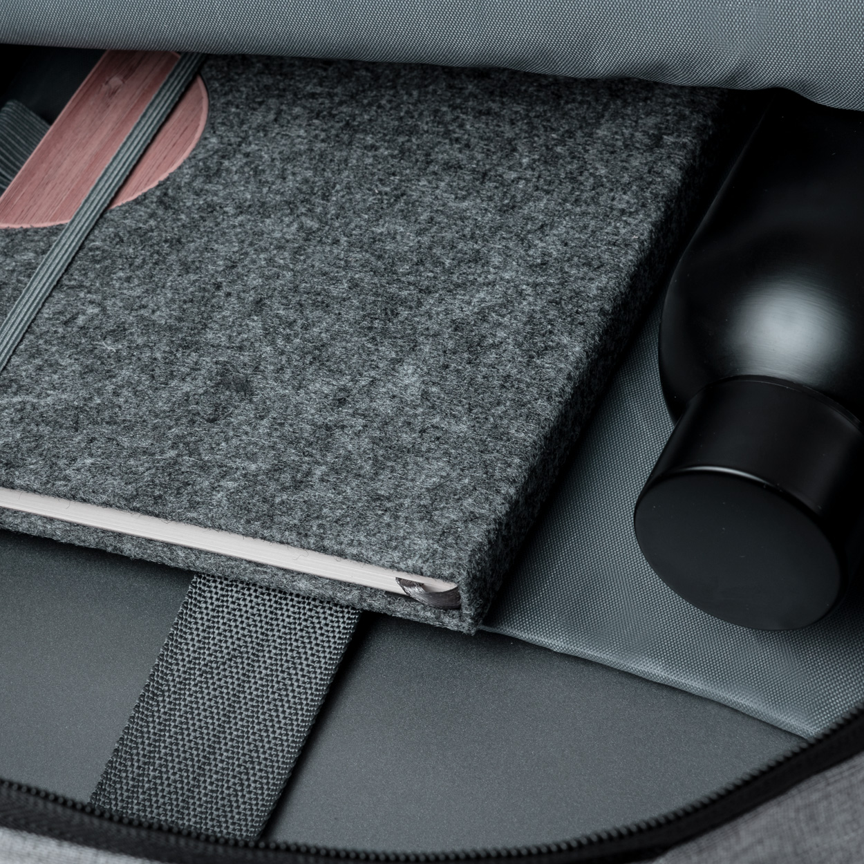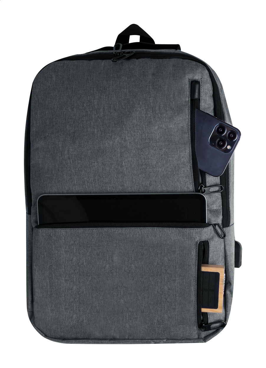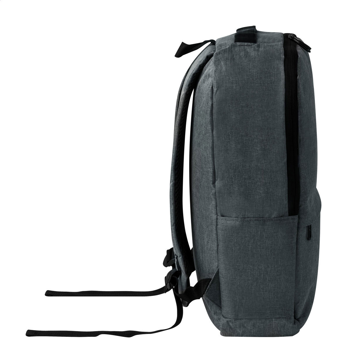 RPET-Rucksack mit Reißverschlussfächern, gepolstertem Laptop- (15") und Tabletfach (10"), gepolstertem Rücken und Schultergurten. Material: 600D RPET-Polyester. Mit RPET-Label.