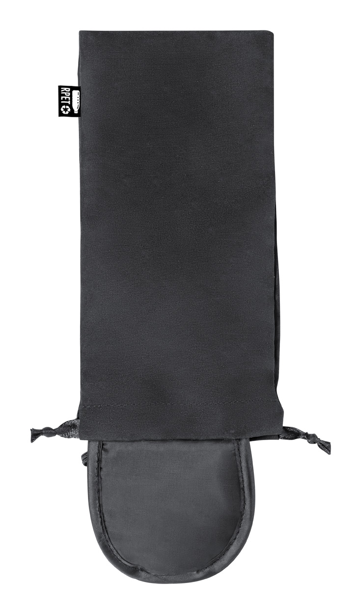 Schlafbrille aus RPET-Polyester mit Gummibändern, einzeln verpackt im RPET-Beutel mit Kordelzug. Mit RPET-Label.