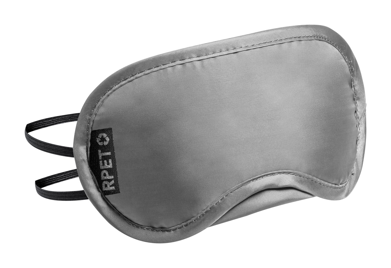 Schlafbrille aus RPET-Polyester mit Gummibändern, einzeln verpackt im RPET-Beutel mit Kordelzug. Mit RPET-Label.