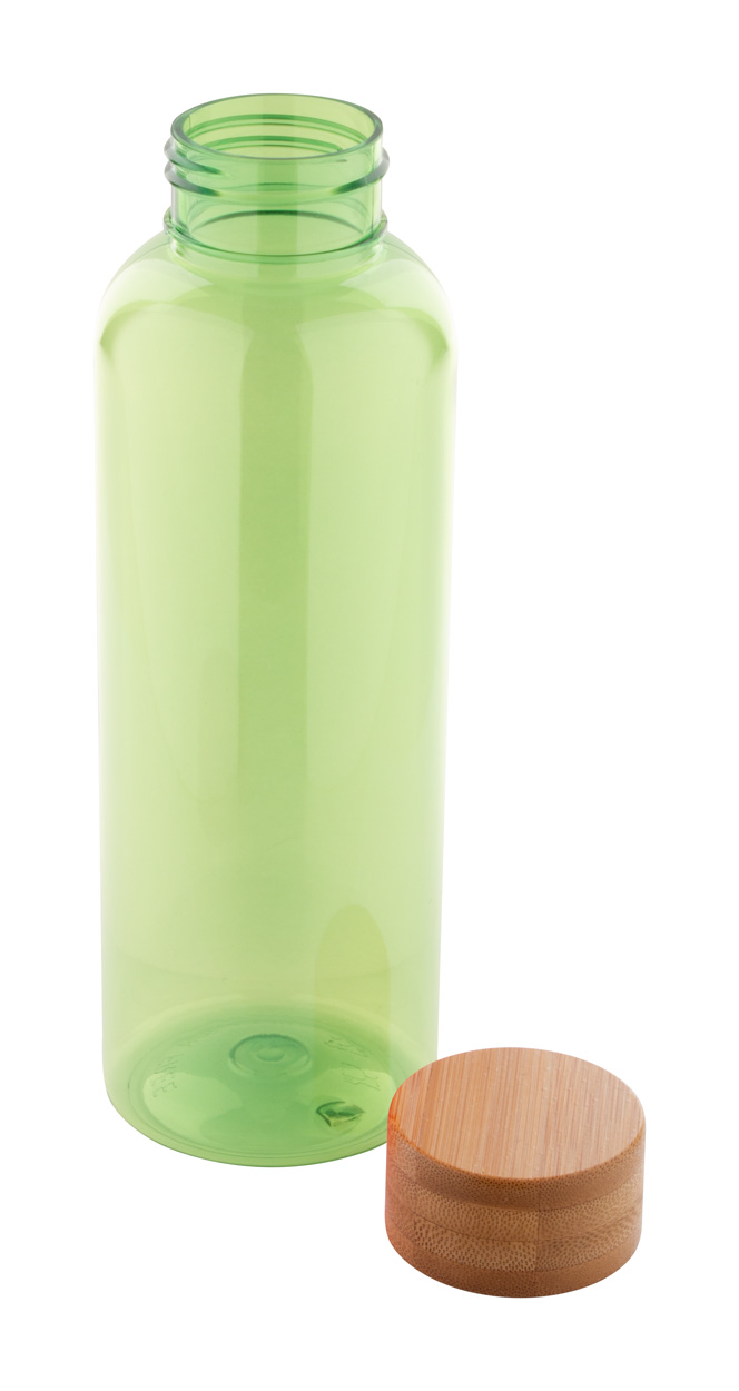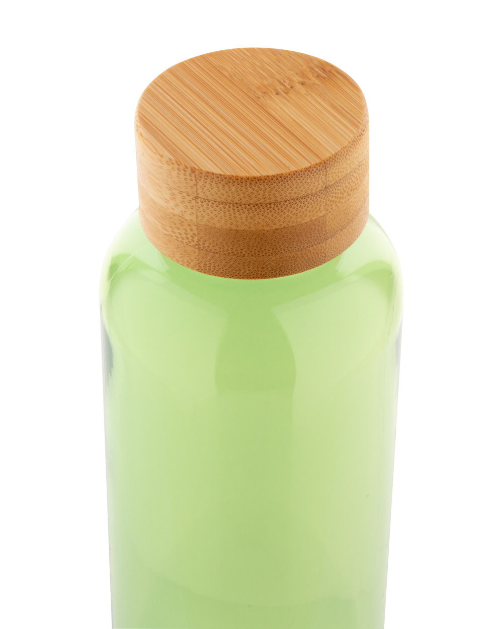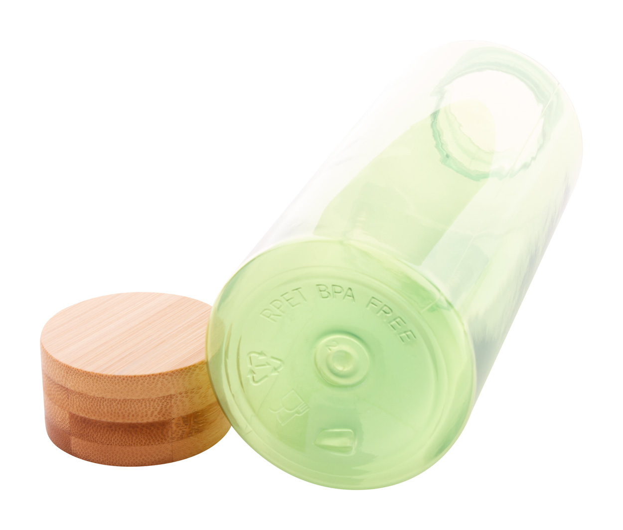 Sportflasche aus RPET-Kunststoff (BPA-frei) mit Bambusdeckel. Füllmenge: 500 ml. Nicht geeignet für kohlensäurehaltige Getränke.