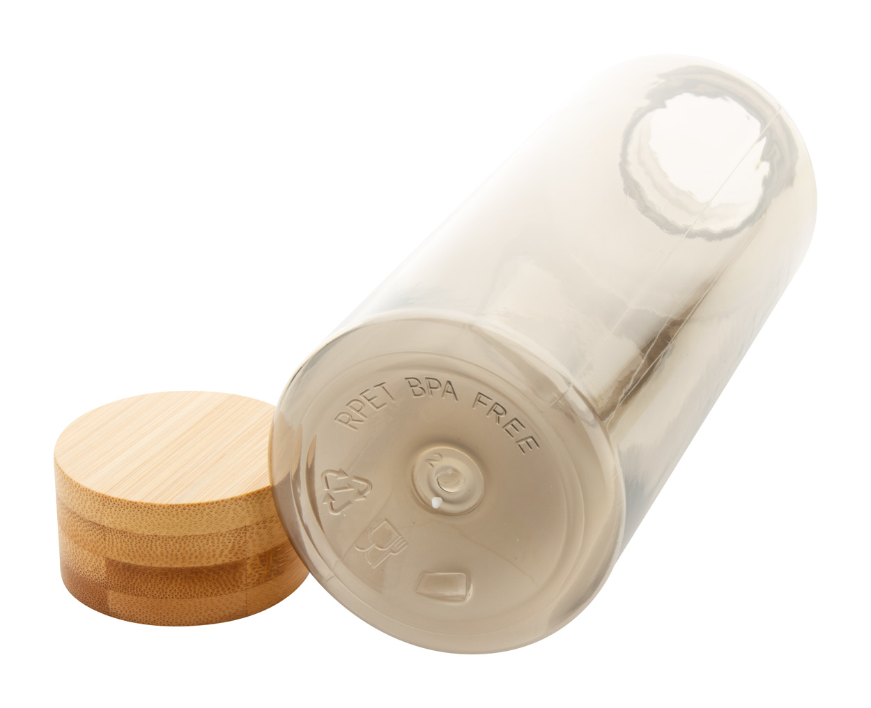 Sportflasche aus RPET-Kunststoff (BPA-frei) mit Bambusdeckel. Füllmenge: 500 ml. Nicht geeignet für kohlensäurehaltige Getränke.