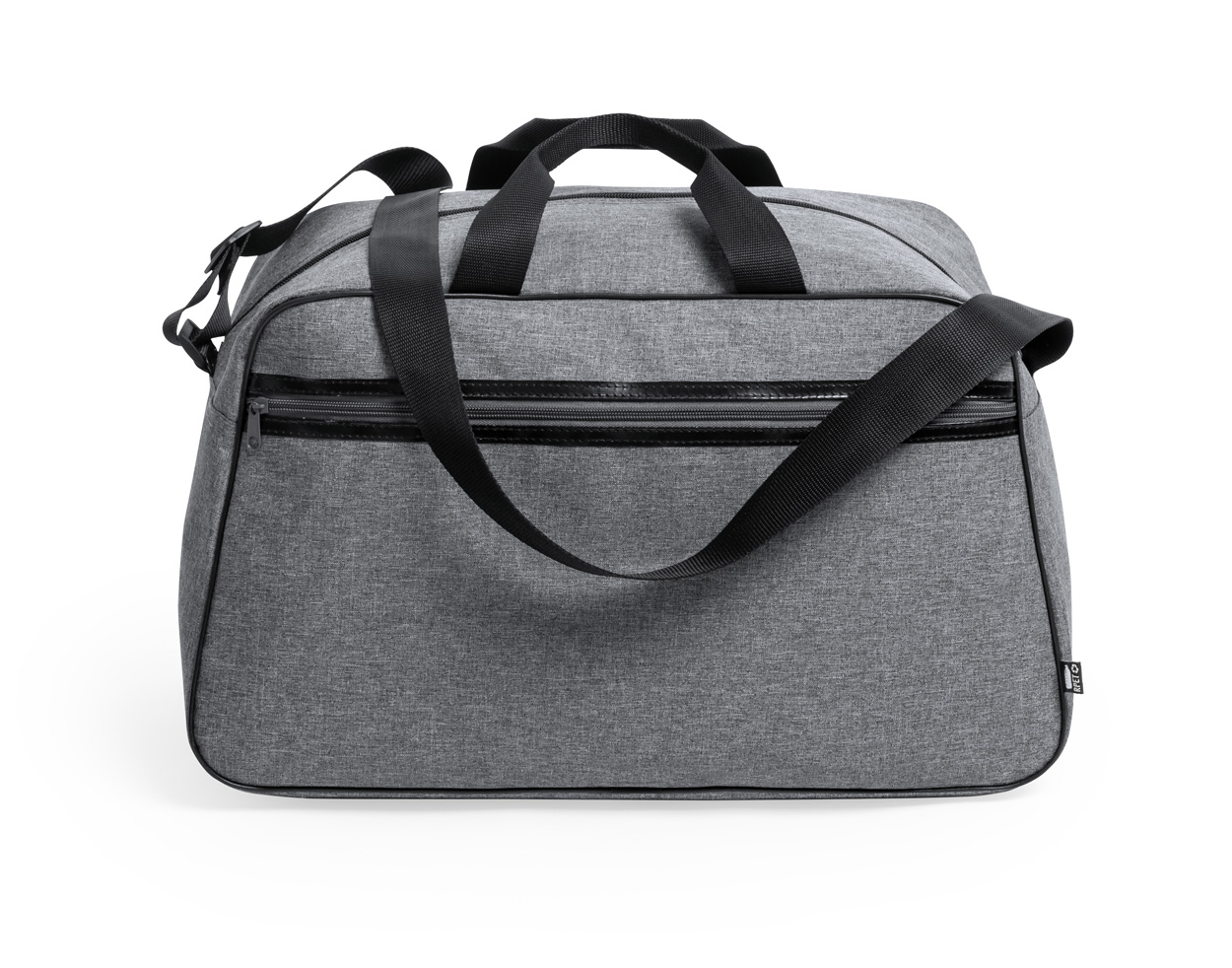 RPET Sporttasche mit zwei Reißverschlussfächern, verstellbarem Schultergurt und dekorativen PVC-Streifen. Material: 600D RPET Polyester (mit RPET-Label).