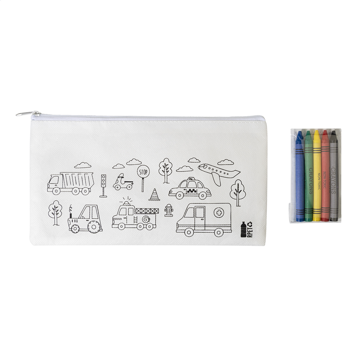 Reißverschluss-Stiftetasche zum Ausmalen aus RPET Non-Woven mit 5 Wachsmalstiften.