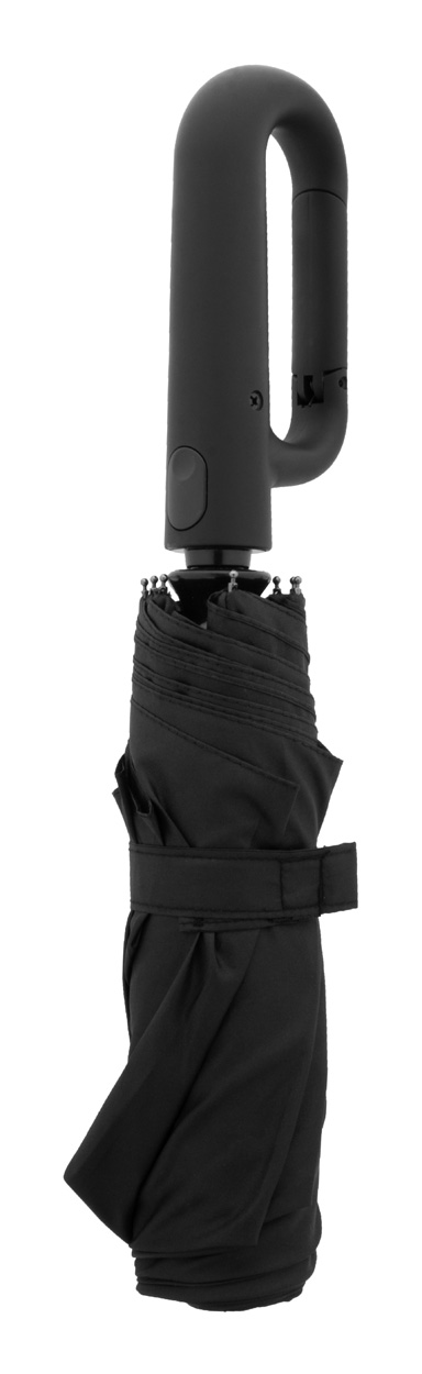 Vollautomatischer (Öffnen / Schließen) Windproof-Taschenschirm mit 8 Segmenten in farblich passender Hülle. Mit Metallrahmen, Fiberglasspeichen und gummiertem Karabinergriff. Material: 190T RPET-Pongee. Mit RPET-Label.