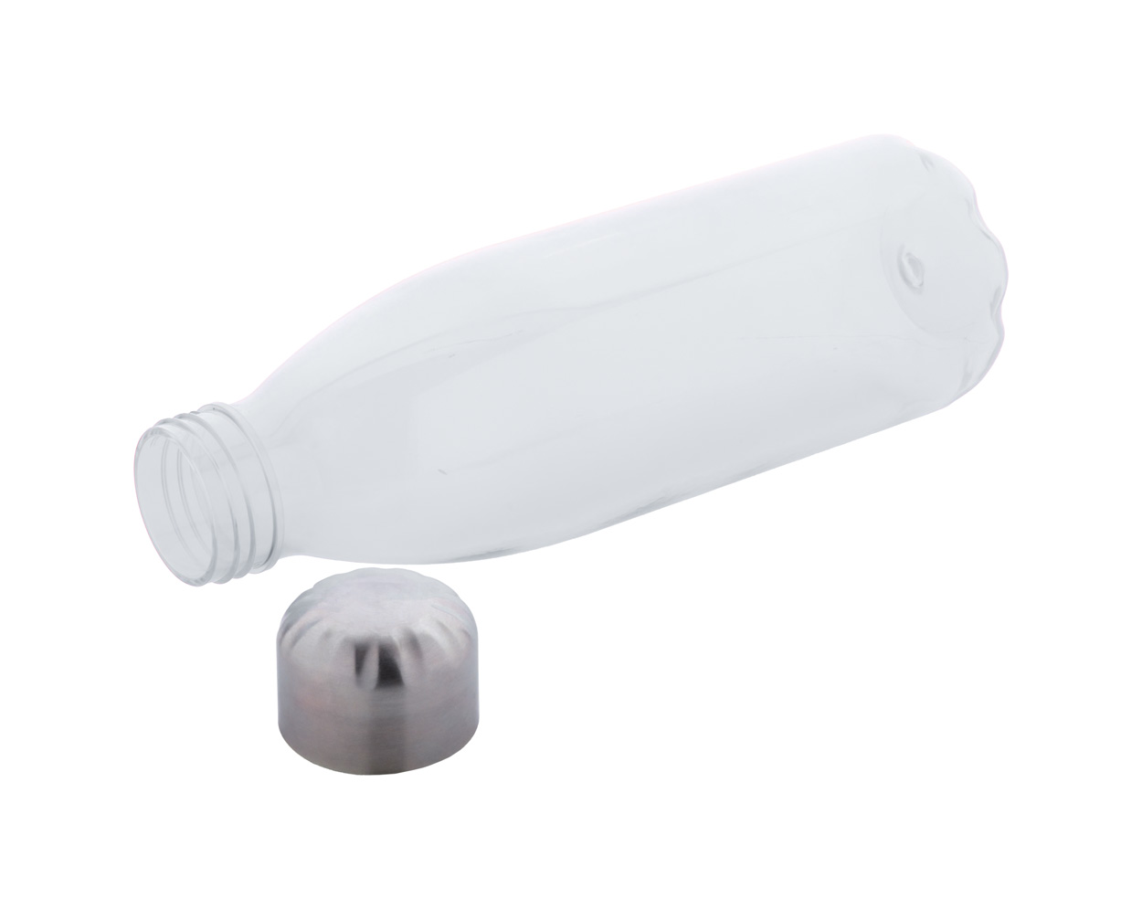 Trinkflasche aus RPET (BPA-frei) mit Edelstahldeckel. Füllmenge: 600 ml. Nicht geeignet für kohlensäurehaltige Getränke.