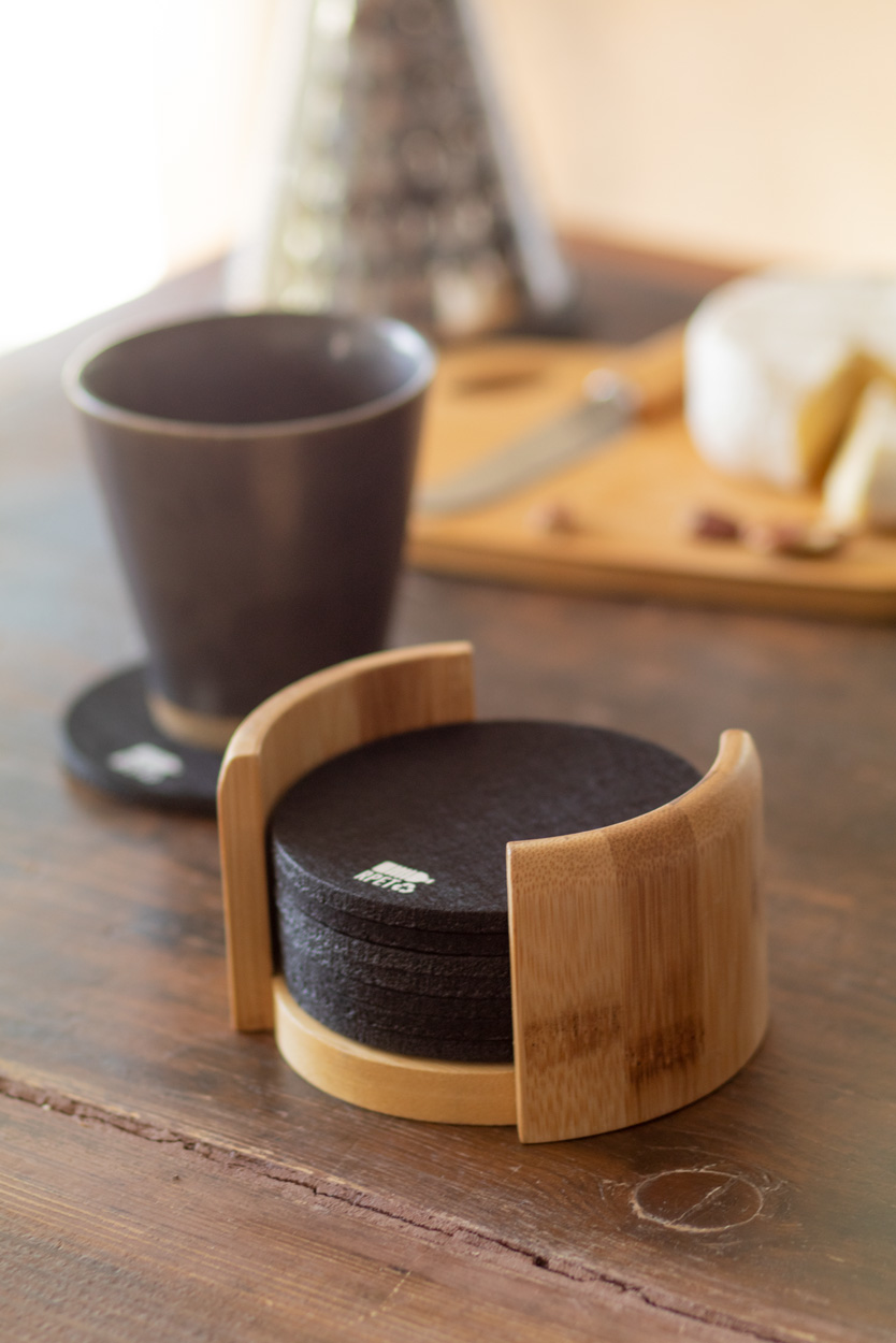 10-teiliges Untersetzer-Set aus RPET Filz in einem Spender aus Bambus und RPET-Logo auf jedem Untersetzer.