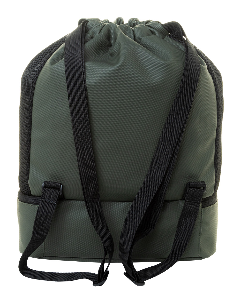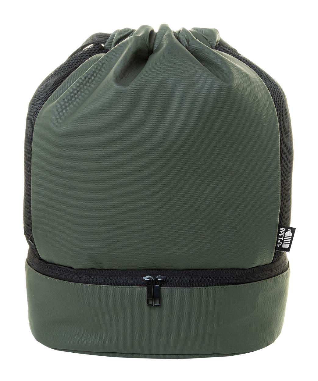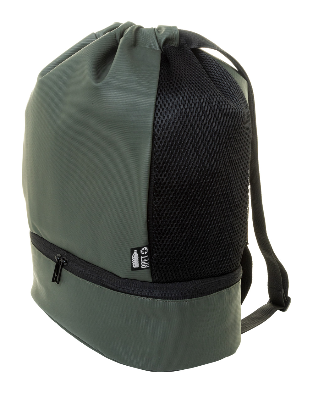 Hochwertiger RPET-Kordelzugbeutel mit Reißverschluss-Schuhfach, seitlichen Mesh-Einsätzen und breiten Trägern. Material: PU-beschichtetes 600D RPET-Polyester. Mit RPET-Label.