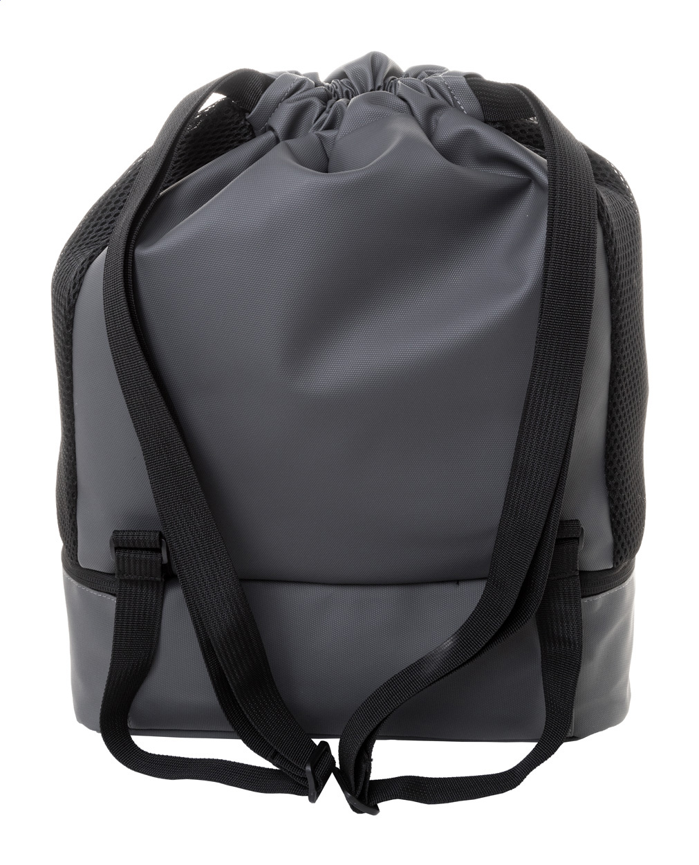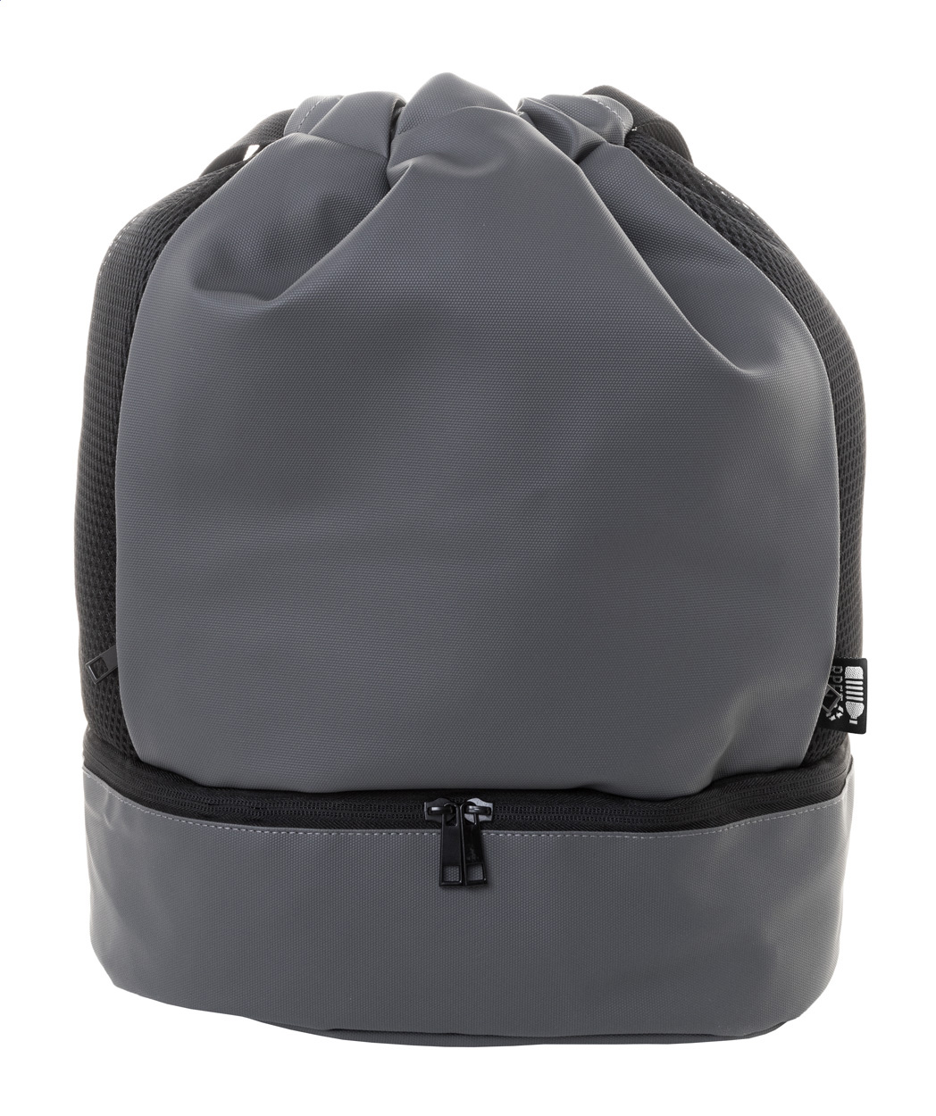 Hochwertiger RPET-Kordelzugbeutel mit Reißverschluss-Schuhfach, seitlichen Mesh-Einsätzen und breiten Trägern. Material: PU-beschichtetes 600D RPET-Polyester. Mit RPET-Label.