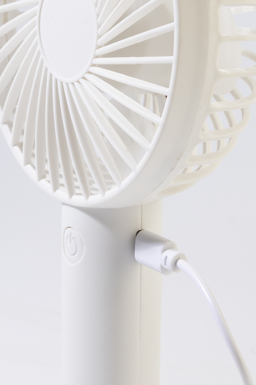 Elektrischer Handventilator aus recyceltem PP mit Handyhalter, eingebautem Akku (800 mAh) und 3-stufigem Geschwindigkeitsregler. Inkl. USB-Ladekabel.
