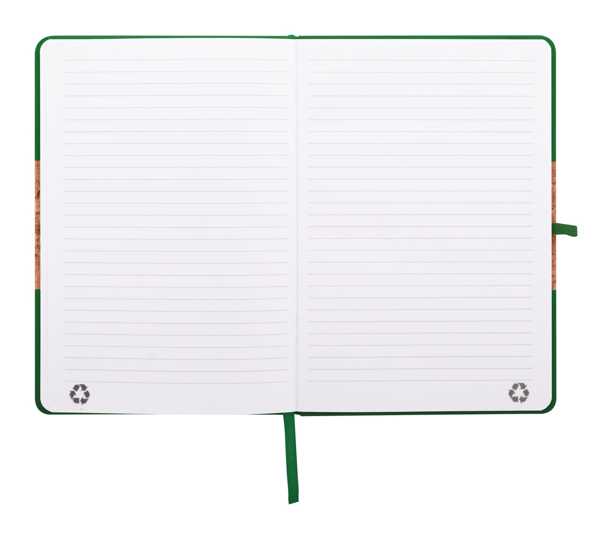 A5 Notizbuch mit Umschlag aus natürlichem Kork und Kunstleder mit farblich abgestimmten Lesezeichen, Gummiband und Stifteschlaufe sowie 80 linierten Seiten aus Recyclingpapier.