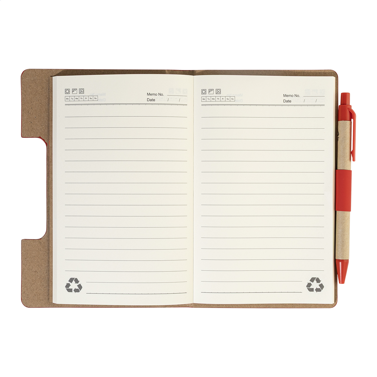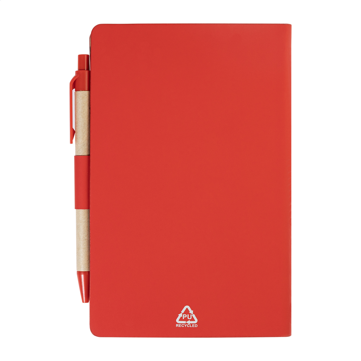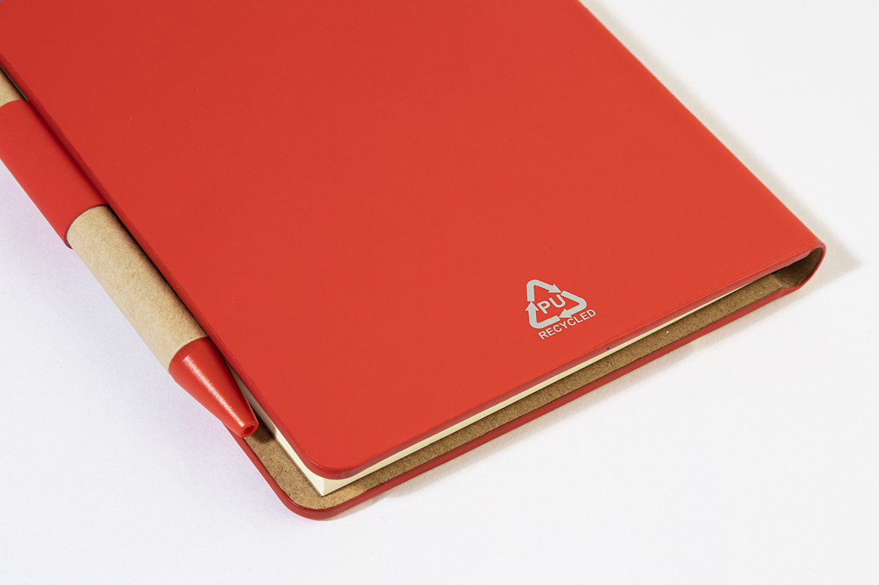Notizbuch mit Cover aus recyceltem PU-Leder mit 70 linierten Blättern aus Recyclingpapier und 125 Seitenmarkern (in 5 verschiedenen Farben). Inklusive Kugelschreiber aus Recyclingpapier und recyceltem PP mit blauer Mine.