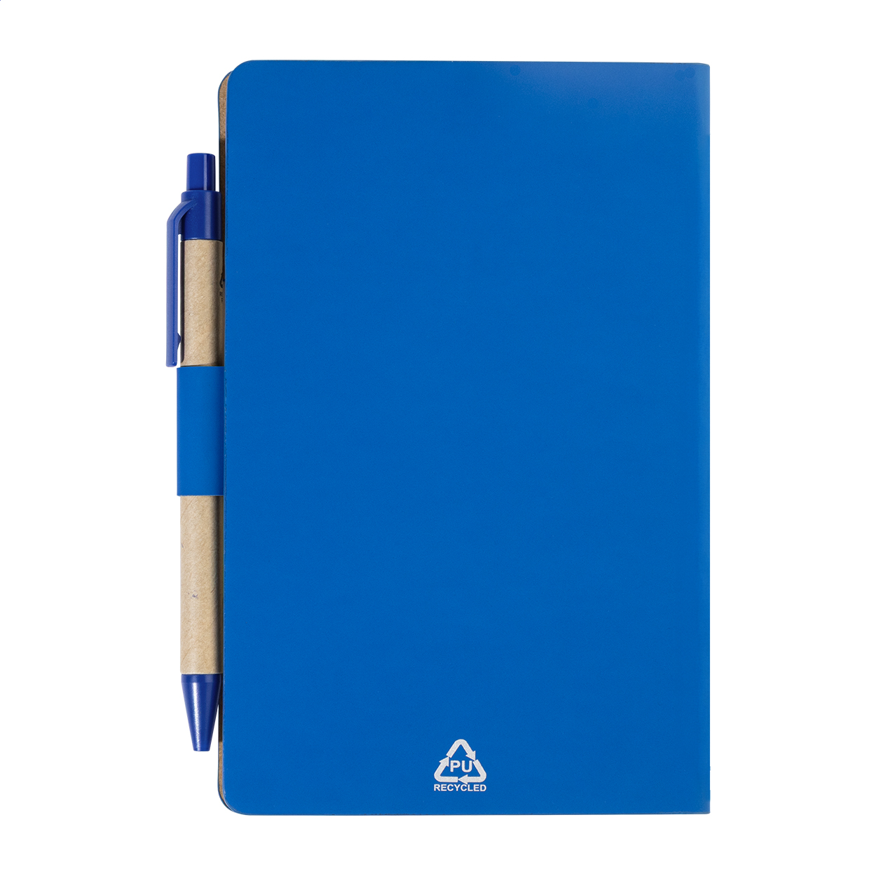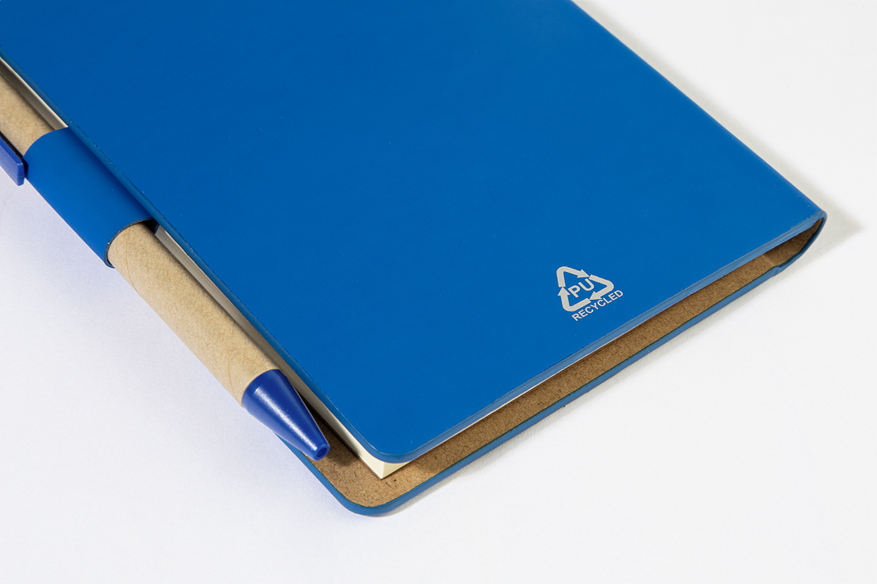 Notizbuch mit Cover aus recyceltem PU-Leder mit 70 linierten Blättern aus Recyclingpapier und 125 Seitenmarkern (in 5 verschiedenen Farben). Inklusive Kugelschreiber aus Recyclingpapier und recyceltem PP mit blauer Mine.