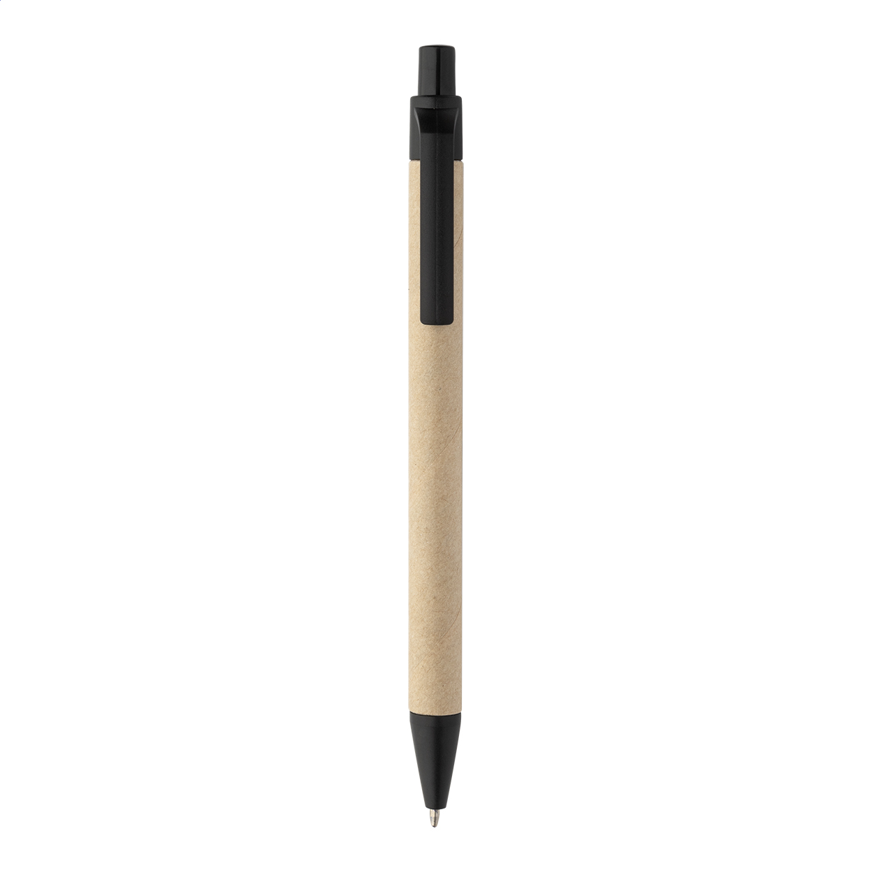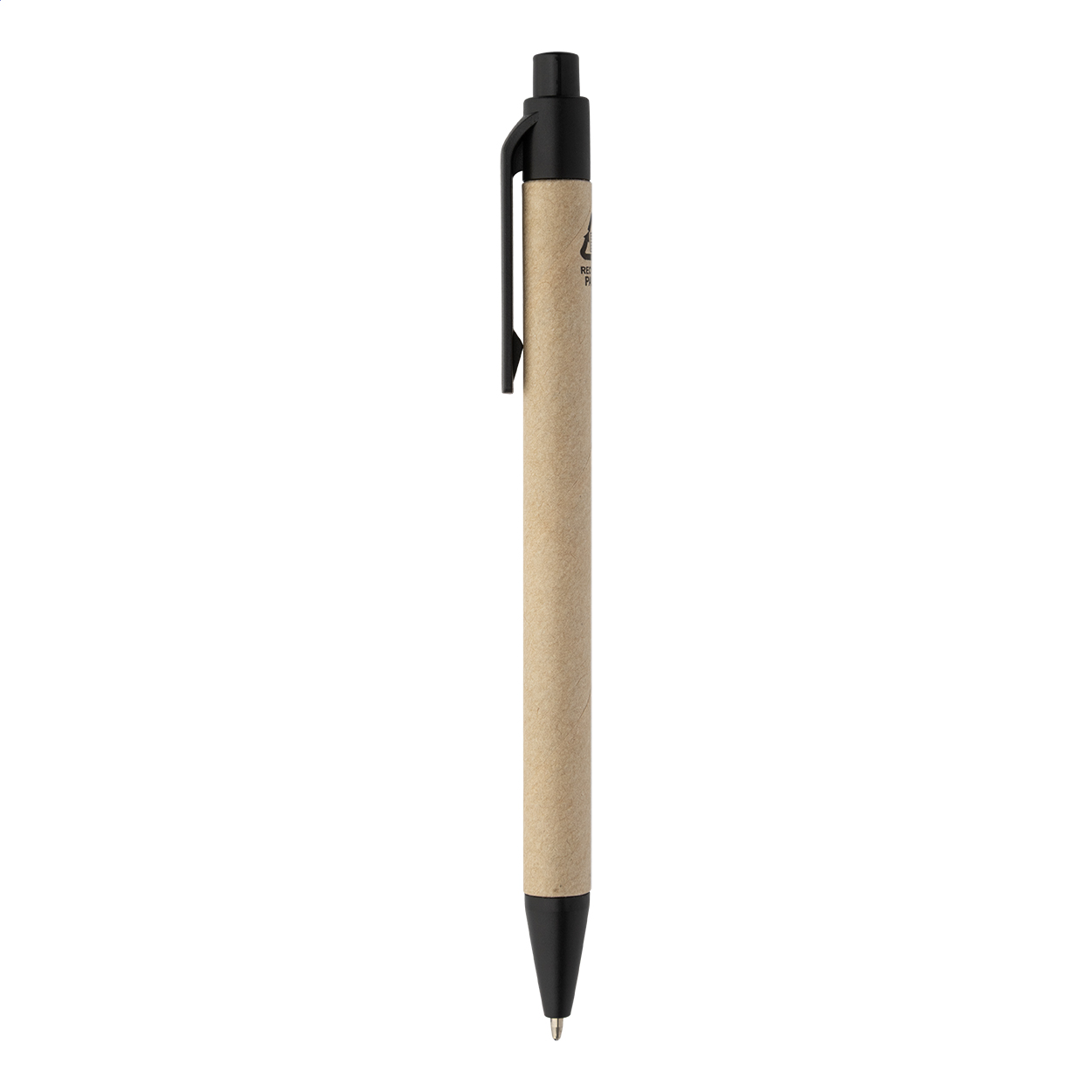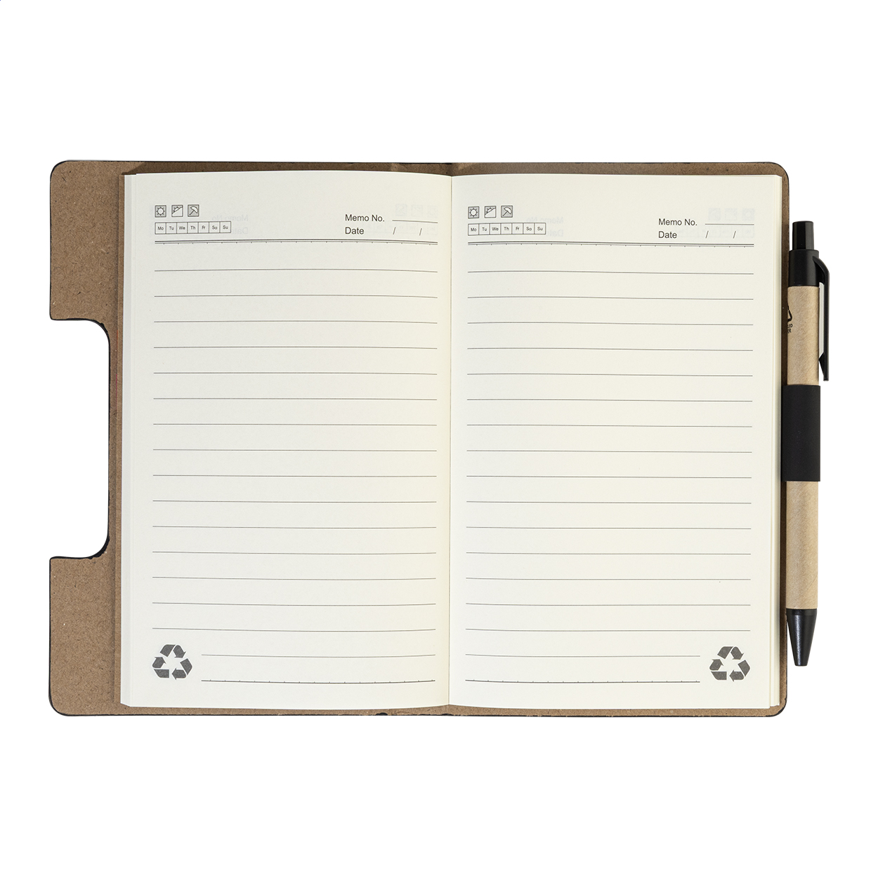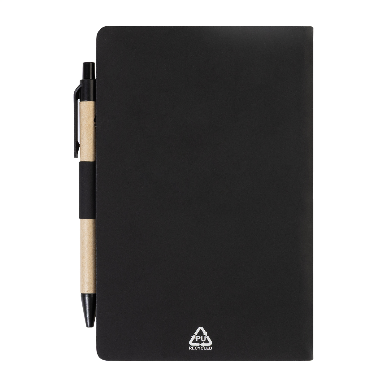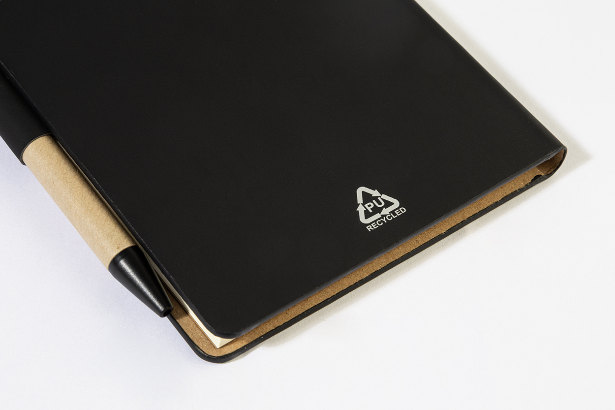 Notizbuch mit Cover aus recyceltem PU-Leder mit 70 linierten Blättern aus Recyclingpapier und 125 Seitenmarkern (in 5 verschiedenen Farben). Inklusive Kugelschreiber aus Recyclingpapier und recyceltem PP mit blauer Mine.