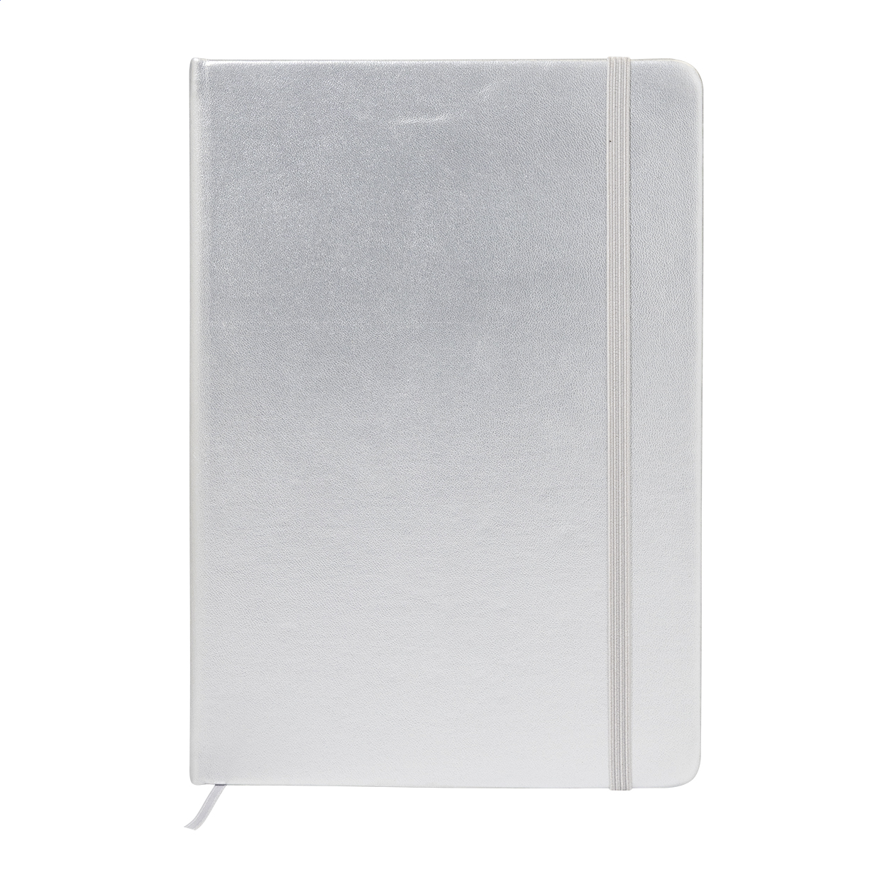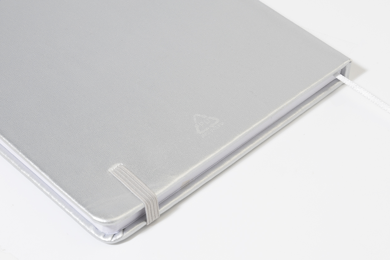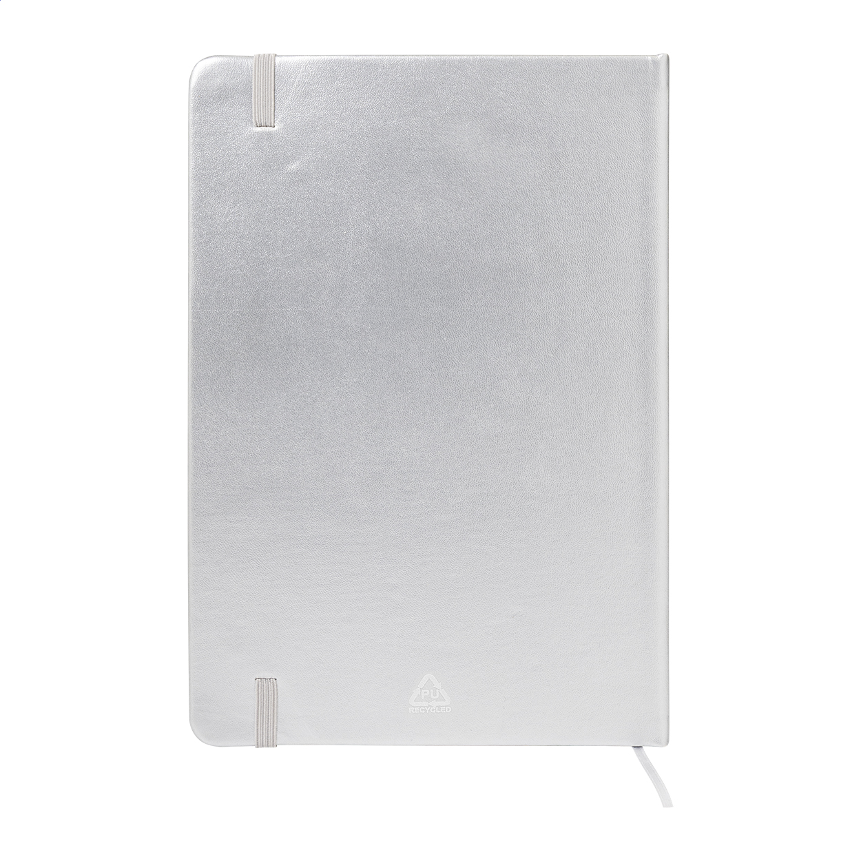 Notizbuch mit metallisch glänzendem Einband aus recyceltem PU-Leder, 100 Blätter (liniert) aus Recyclingpapier. Inklusive farblich abgestimmtem Lesezeichen und Gummiband. Format A5.