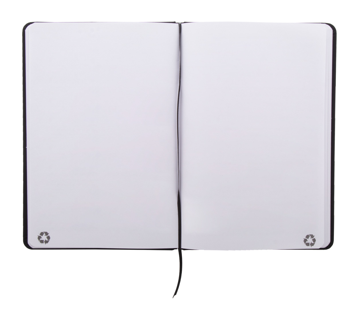 Notizbuch mit recyceltem PU-Lederbezug und 100 blanko Blättern aus Recyclingpapier. Mit farblich passendem Lesezeichen und Gummiband. A5-Größe.