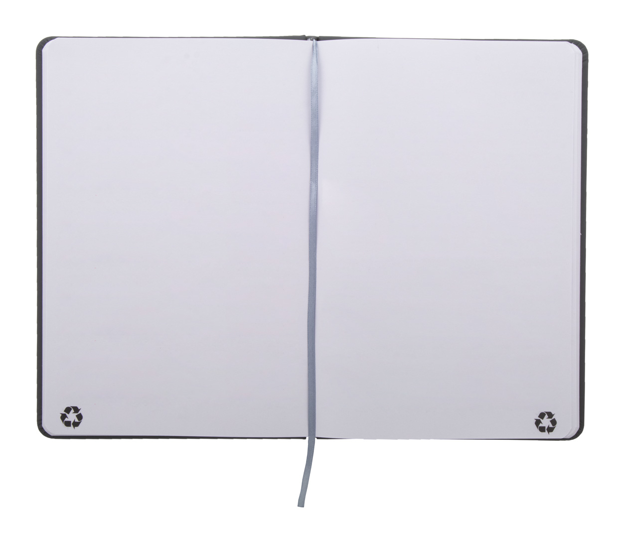 Notizbuch mit recyceltem PU-Lederbezug und 100 blanko Blättern aus Recyclingpapier. Mit farblich passendem Lesezeichen und Gummiband. A5-Größe.