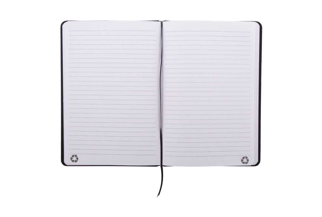 Notizbuch mit recyceltem PU-Lederbezug und 100 linierten Blättern aus Recyclingpapier. Mit farblich passendem Lesezeichen und Gummiband. A5-Größe.