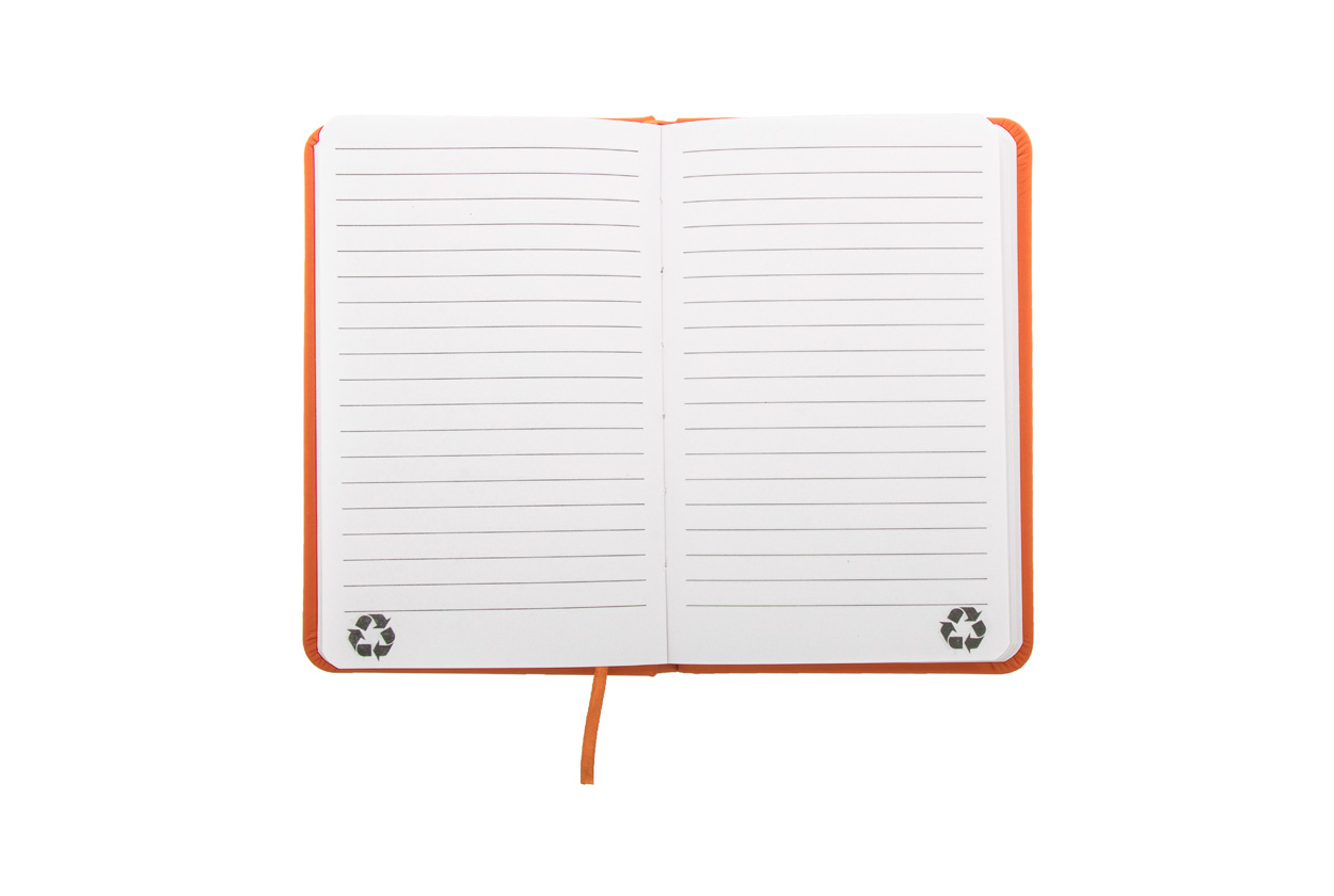 Notizbuch mit recyceltem PU-Lederbezug und 100 linierten Blättern aus Recyclingpapier. Mit farblich passendem Lesezeichen und Gummiband. A6-Größe.
