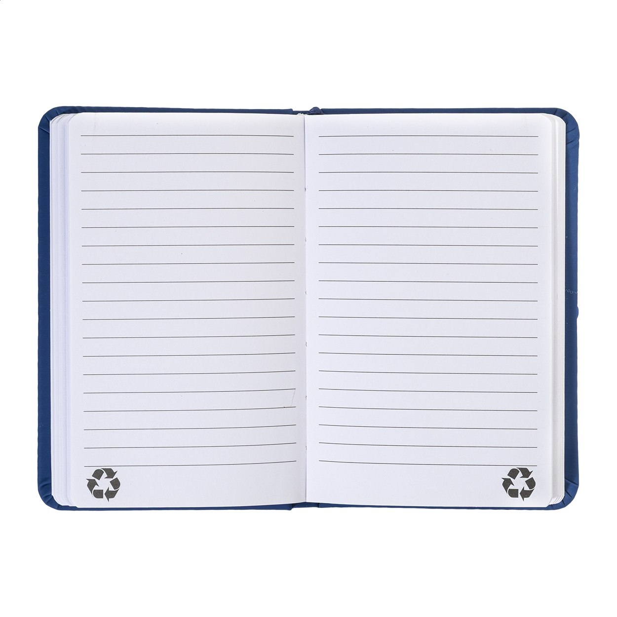 Notizbuch mit recyceltem PU-Lederbezug und 100 linierten Blättern aus Recyclingpapier. Mit farblich passendem Lesezeichen und Gummiband. A6-Größe.