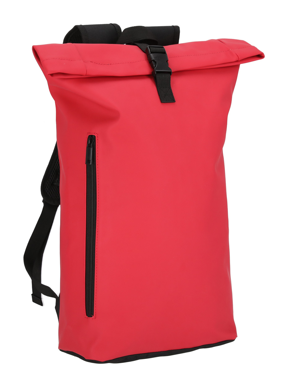 Wasserdichter, weicher Rolltop-Rucksack aus recyceltem PU-Leder mit Schnallenverschluss, Vordertasche mit Reißverschluss und gepolstertem Laptopfach (15"). Mit gepolstertem Rücken und Schultergurten. Mit Label recyceltes PU.