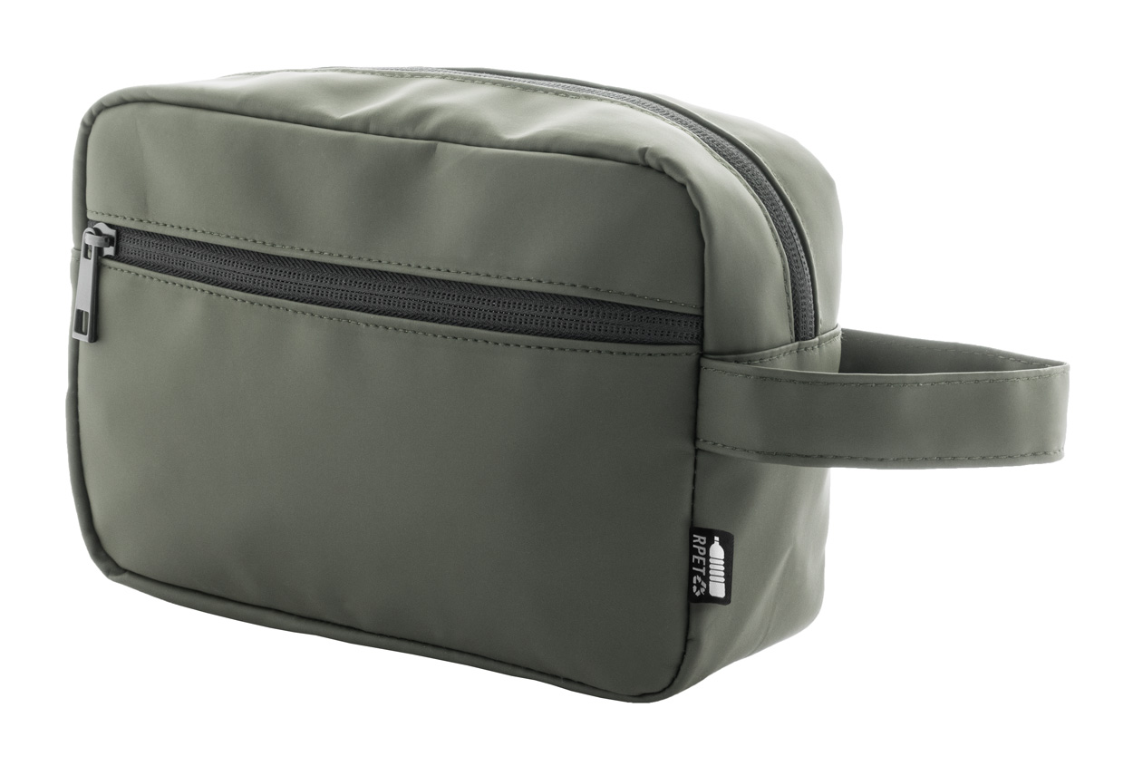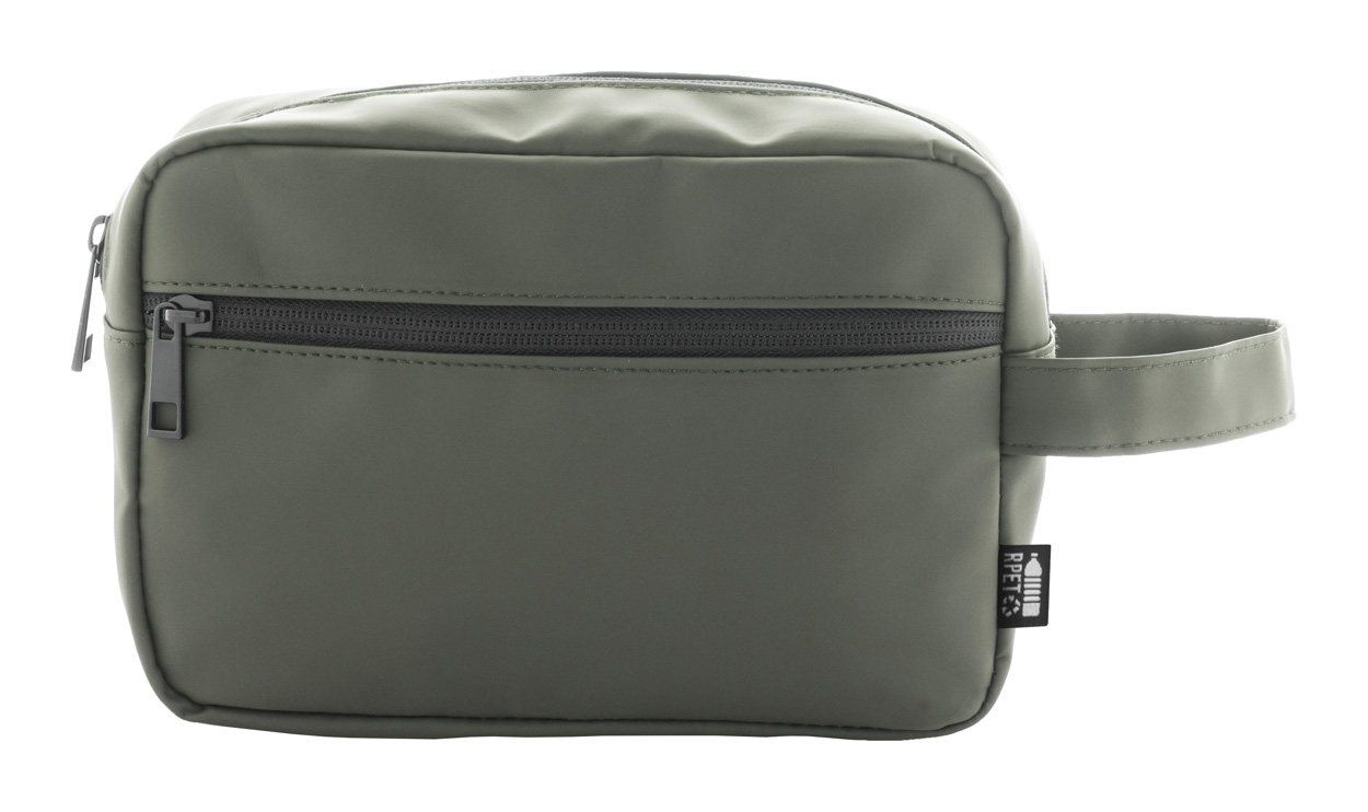 Weiche Kosmetiktasche aus recyceltem Kunstleder mit zwei Reißverschlußfächern, Tragegriff. Mit Label recyceltes Kunstleder.