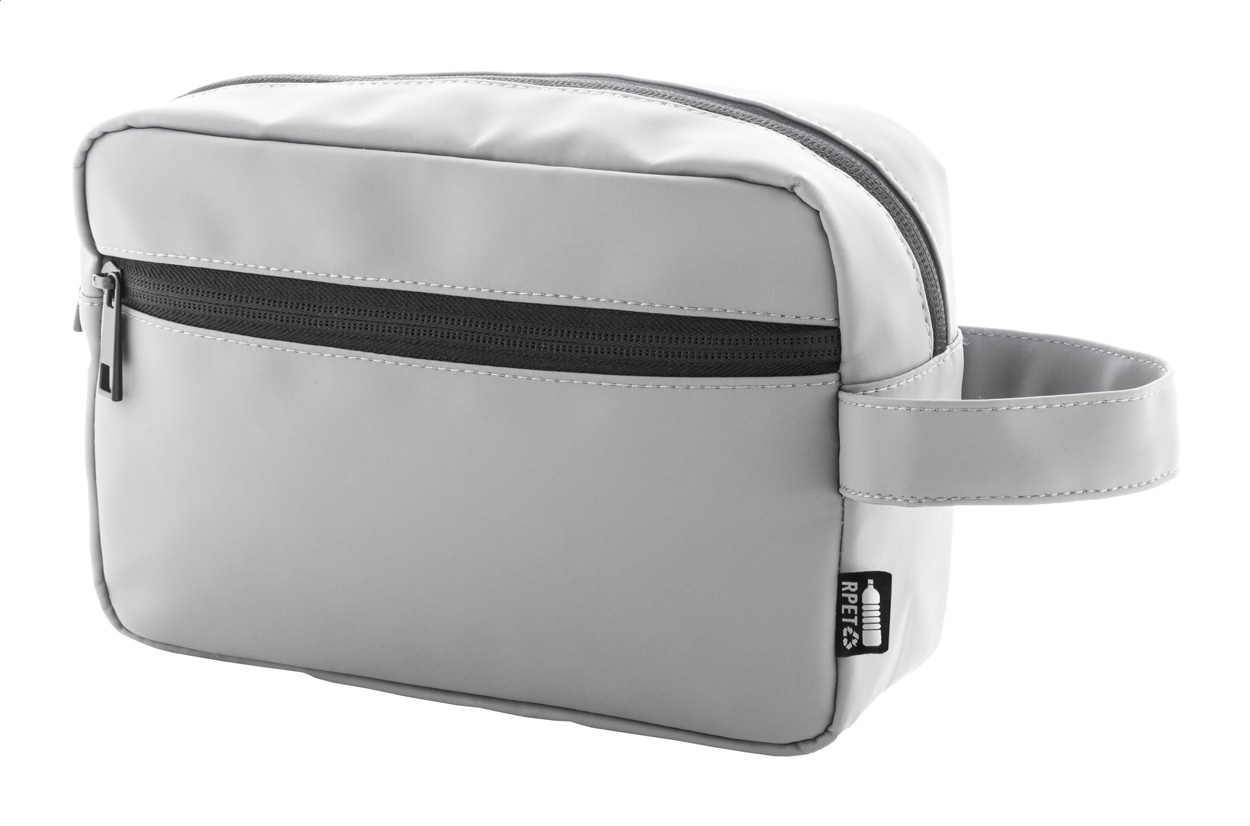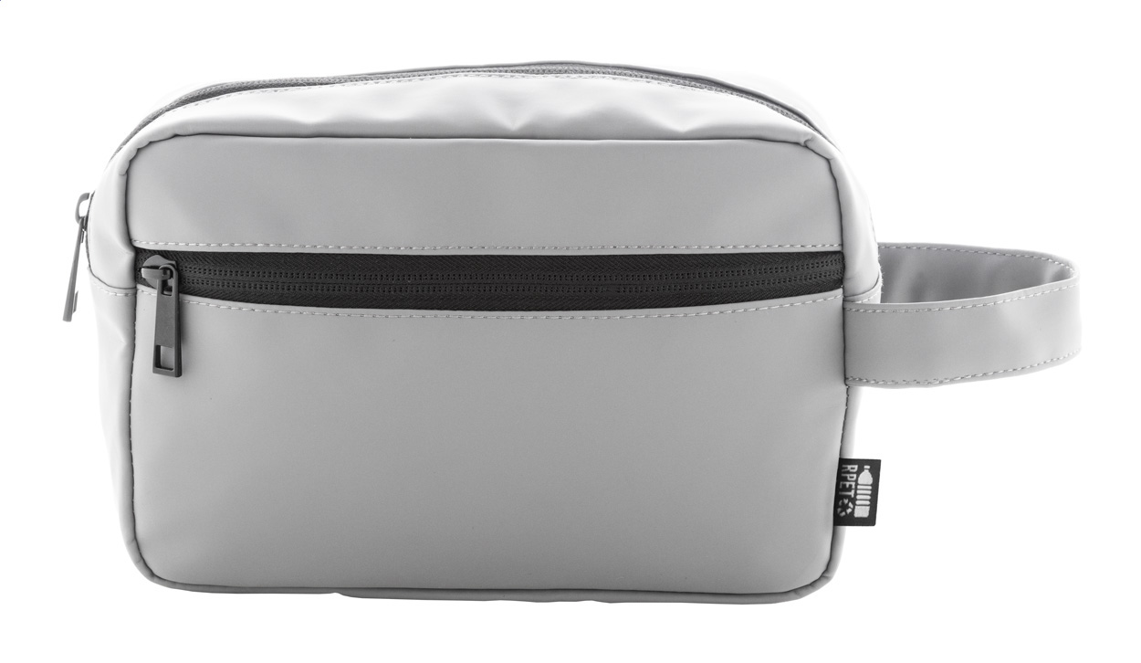 Weiche Kosmetiktasche aus recyceltem Kunstleder mit zwei Reißverschlußfächern, Tragegriff. Mit Label recyceltes Kunstleder.