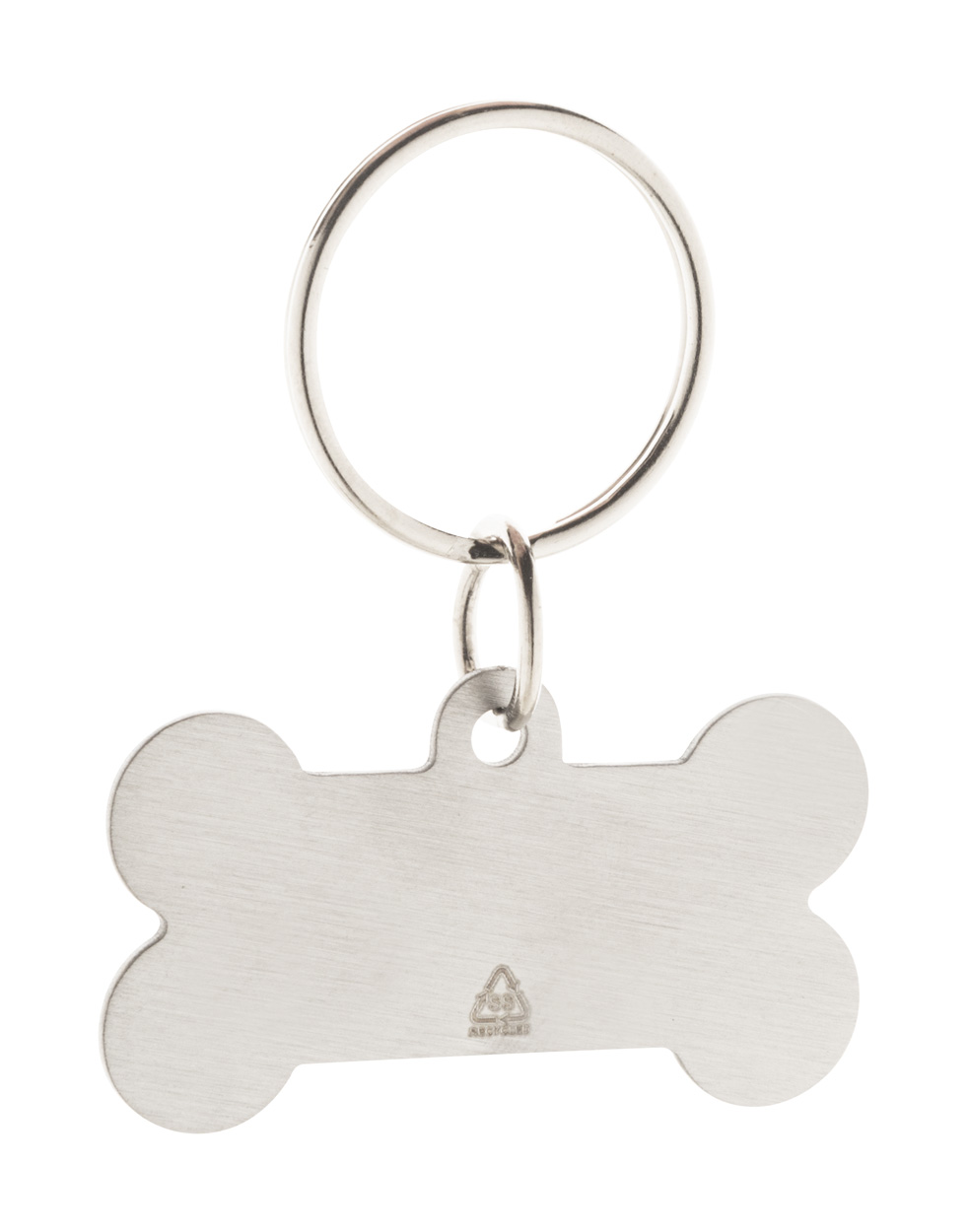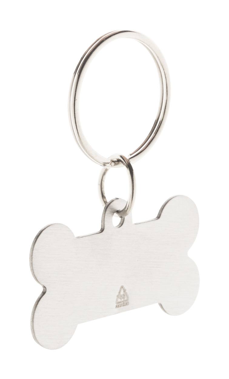 Hundemarke in Knochenform aus recyceltem Edelstahl mit Schlüsselring.