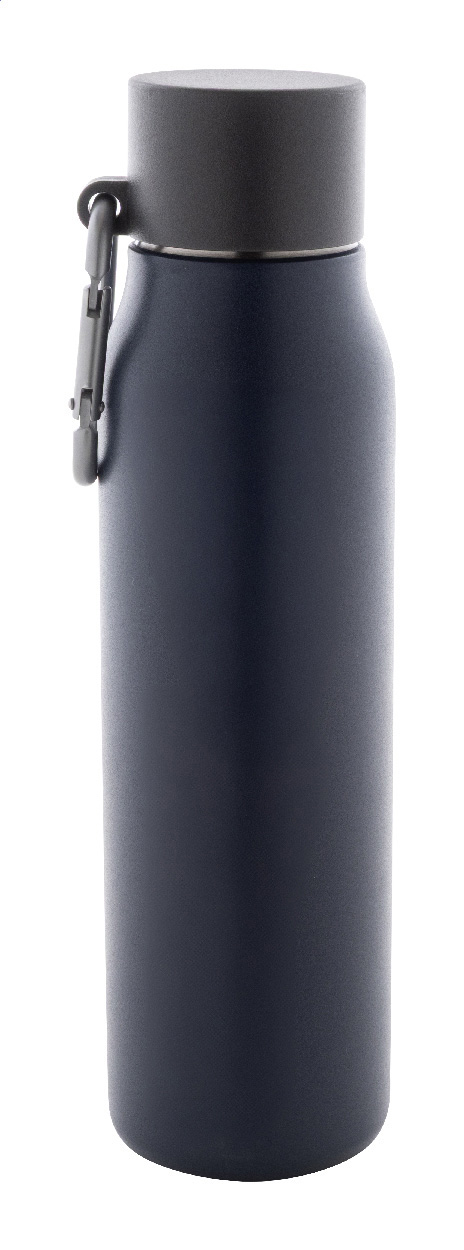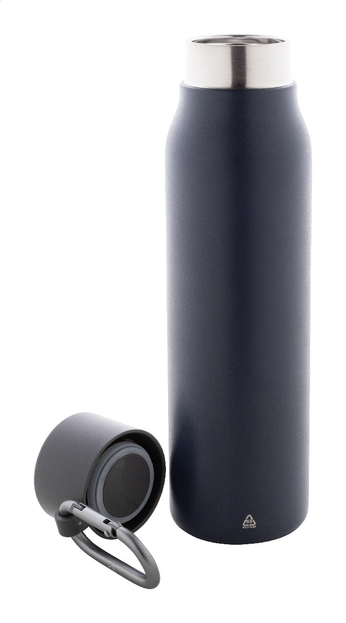 Doppelwandige, isolierte Vakuumflasche aus recyceltem Edelstahl mit PP-Deckel und Karabiner aus recyceltem Aluminium. Füllmenge: 500 ml.