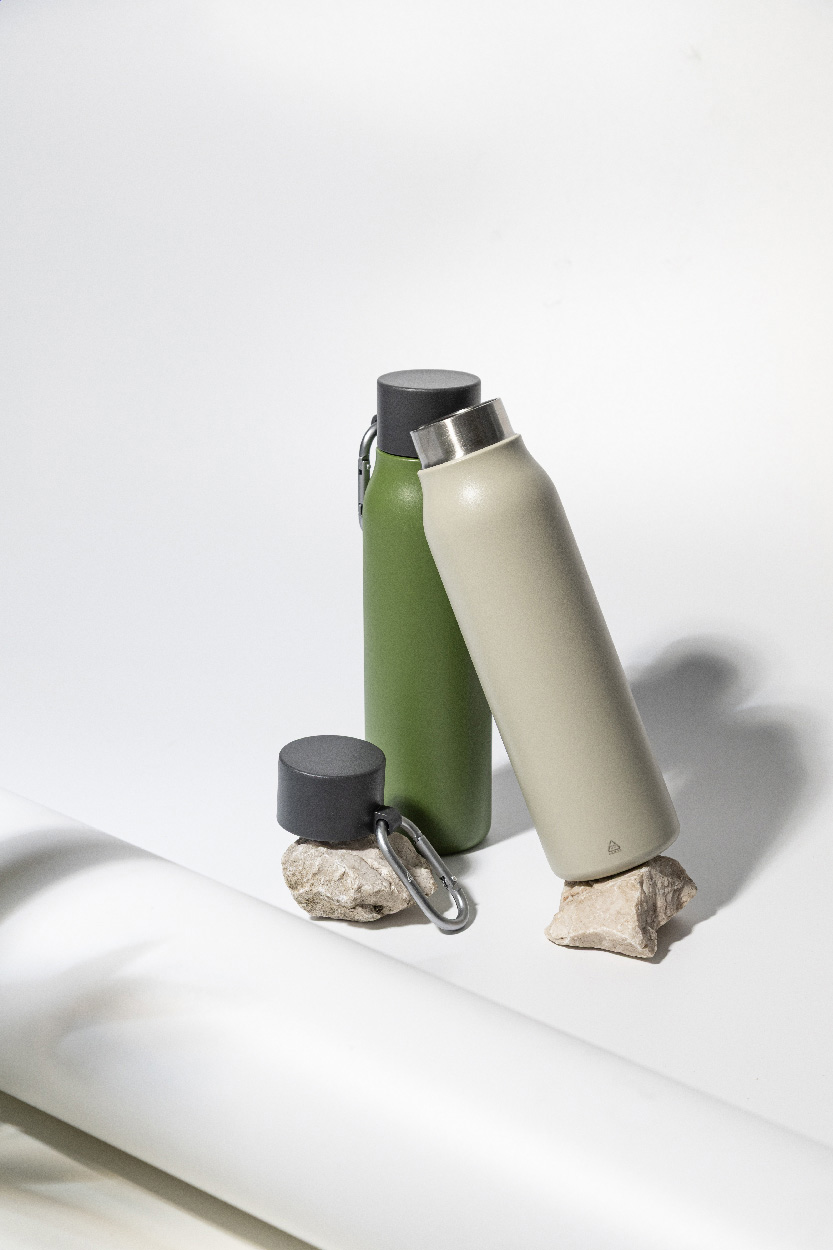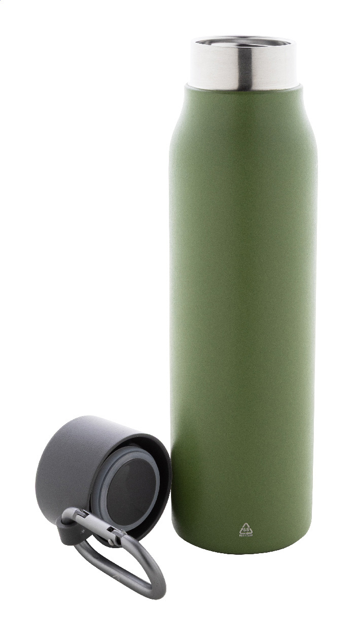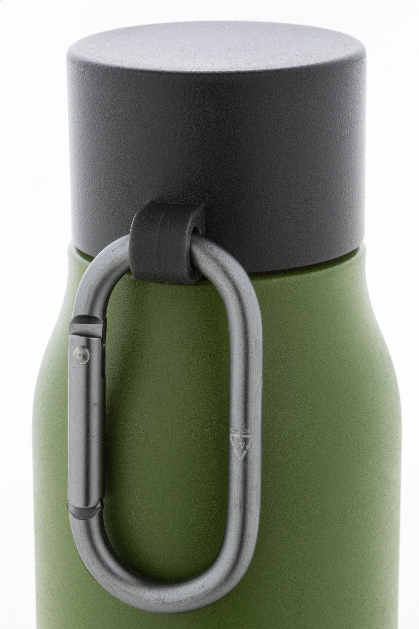 Doppelwandige, isolierte Vakuumflasche aus recyceltem Edelstahl mit PP-Deckel und Karabiner aus recyceltem Aluminium. Füllmenge: 500 ml.