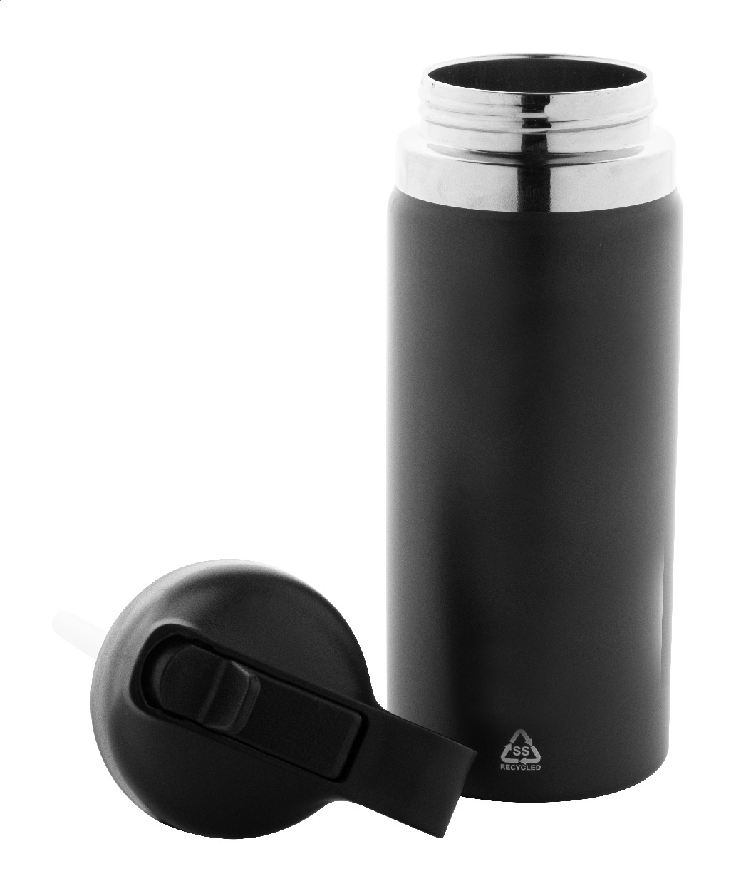 Doppelwandige Isolierflasche aus recyceltem Edelstahl mit klappbarem PP-Trinkverschluss, Tragegriff und integriertem Strohhalm. Füllmenge: 500 ml.